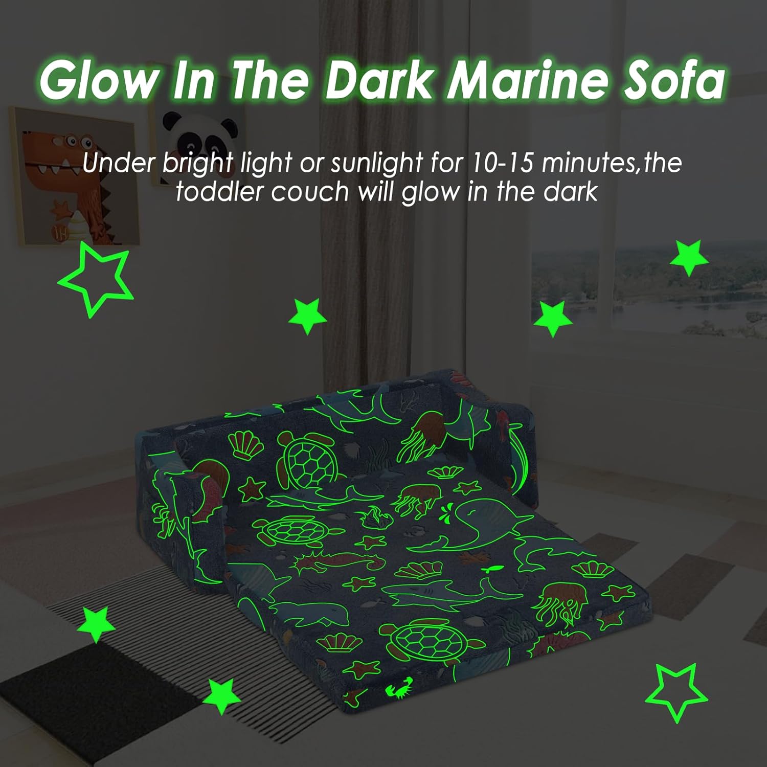 - Glow-in-the-dark design: Features a unique luminous design with a cute marine animals pattern.Under bright light or sunlight for 10-15 minute,the toddler couch will glow in the dark