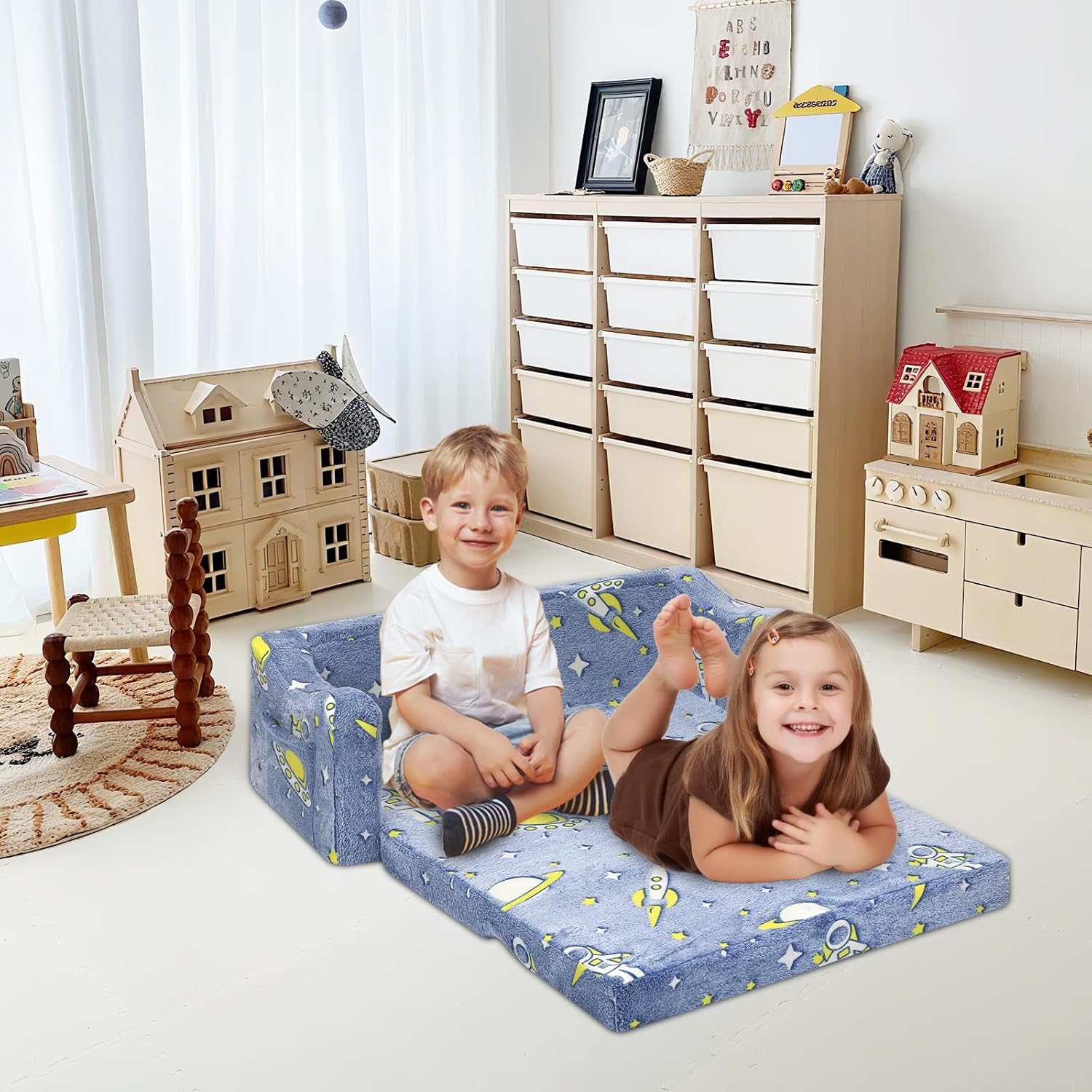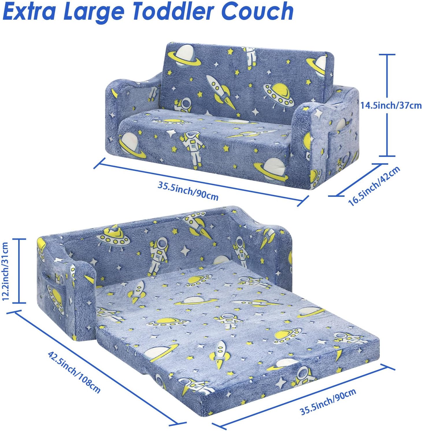 Kids Couch Extra Large,Glow in The Dark 2-in-1 Folding Kids Sofa Bed for Boys,2 Seats Convertible Sleeper Lounger Toddler Couch for Children Bedroom Playroom Nursery,Astronaut