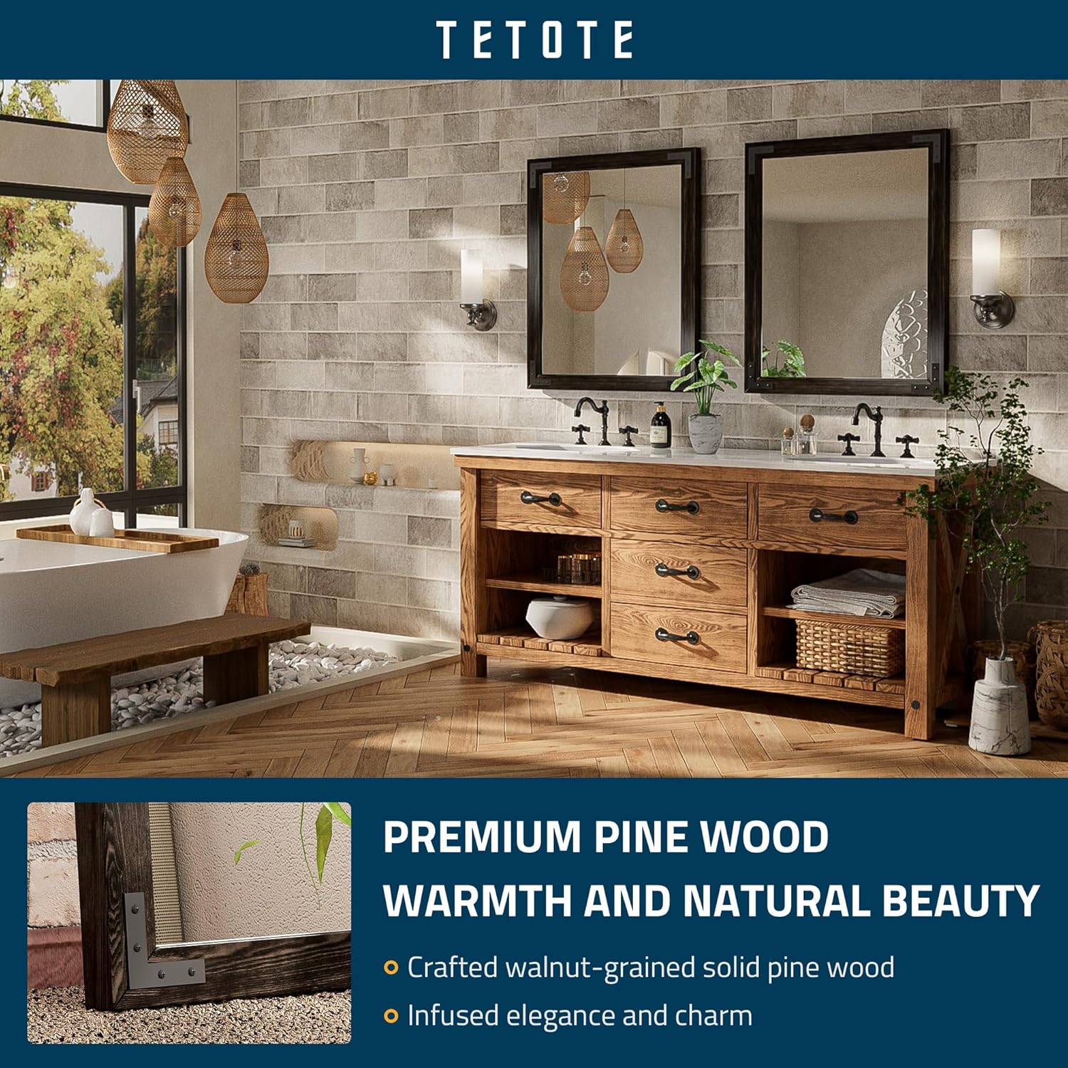 - 【Rustic Pine Solid Wood Frame】TETOTE black wood bathroom mirror is made of premium pine solid wood, and its natural pine grain is full of rustic chic charm and farmhouse warmth, making it a great addition to brighten up your house in the bathroom, bedroom, living room, entryway, or anywhere. Due to the color of the wood itself, there may be a slight color difference when purchasing 2 pieces at the same time.