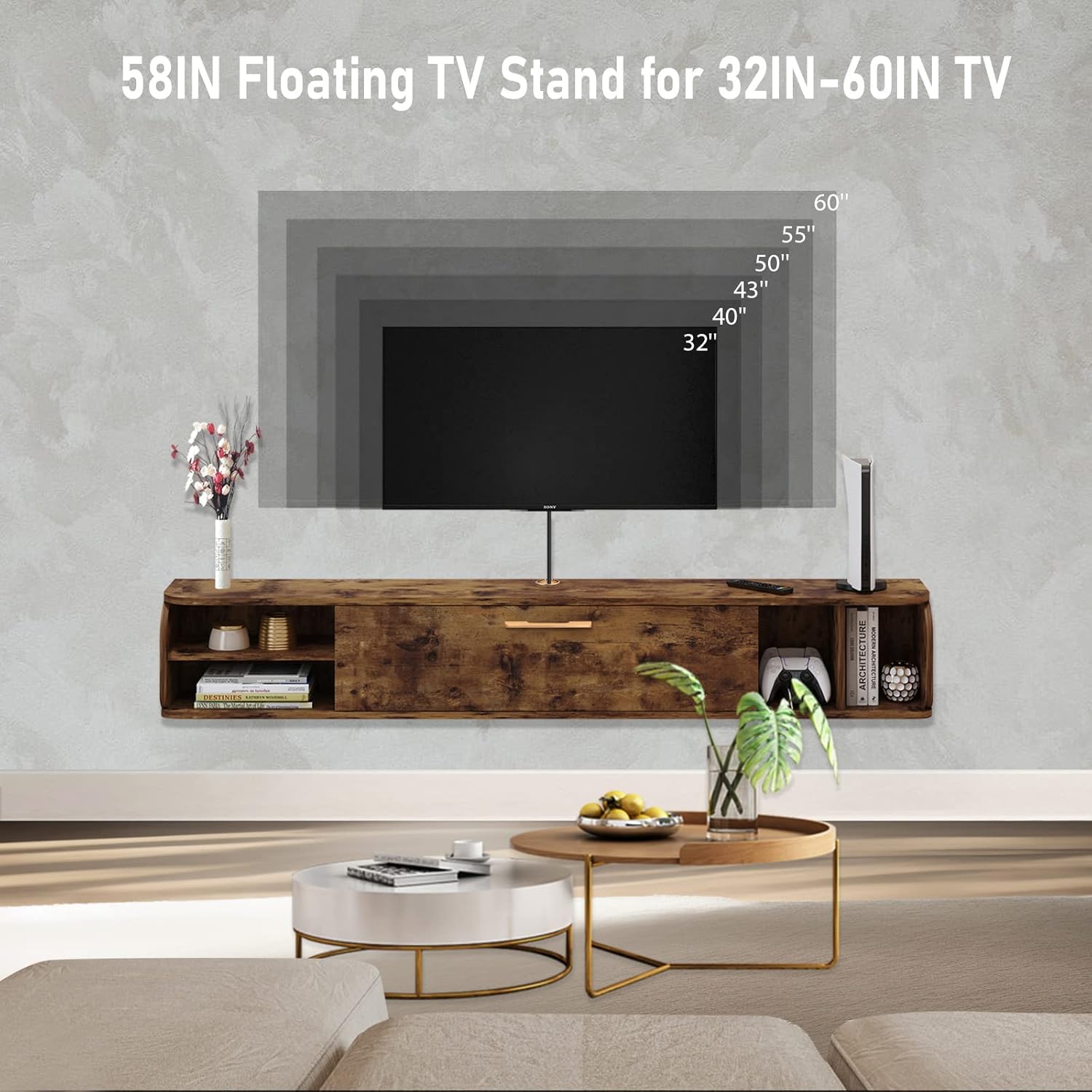 - [Large Storage Space] Floating TV unit with 1 large door and 4 cabinets. It helps to free space for cable boxes, CDs, DVDs, game consoles, projectors, TV components, jewelry, collectibles, photos or small ornaments.
