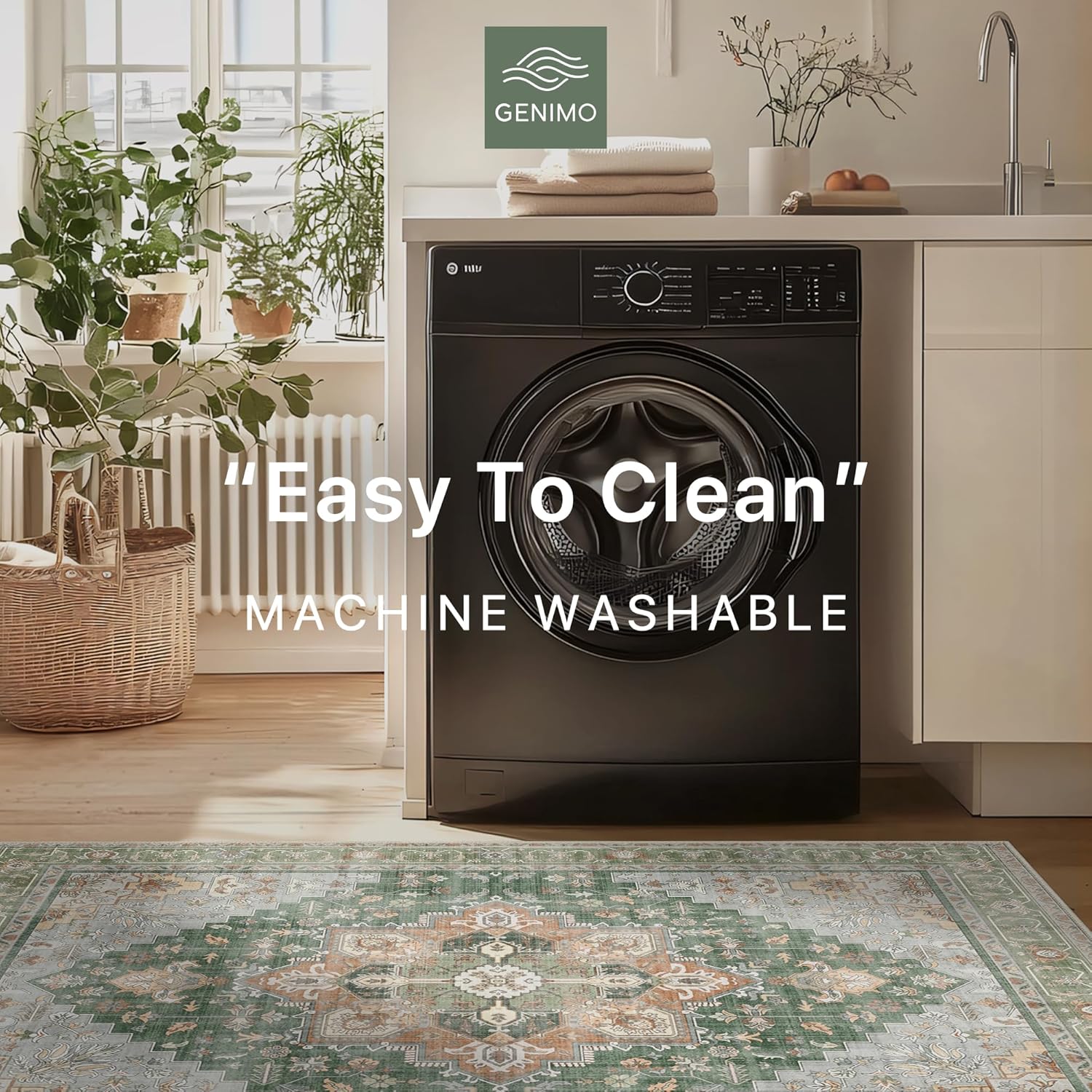 GENIMO 5x7 Area Rugs for Living Room, Machine Washable Non Slip Vintage Rugs, Low Pile Lightweight Chenille Print Rug for Bedroom, Dining Room, Home Office,Sage Green