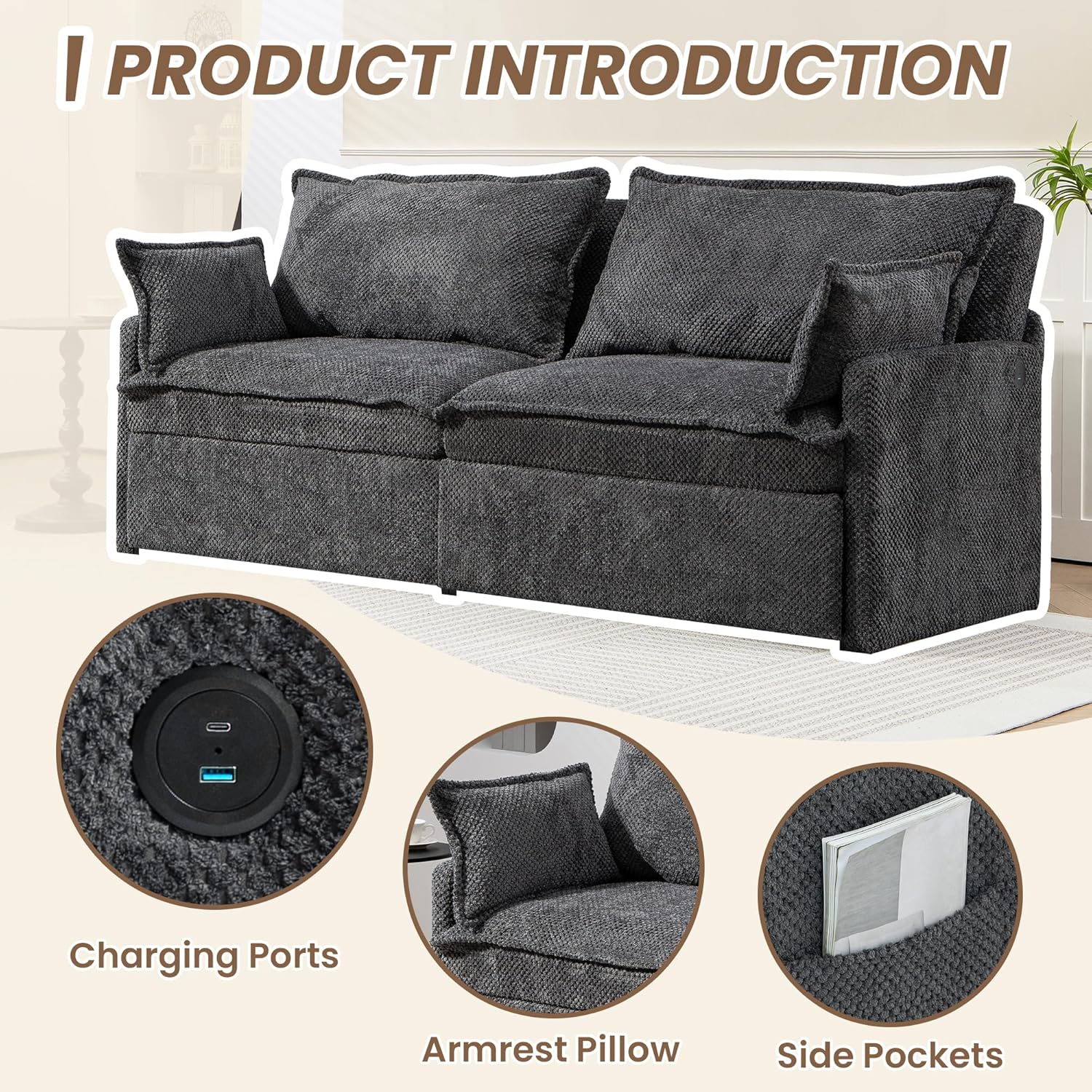 - USB/TYPE-C RECLINER SOFA: This modern sofa features built-in USB/C-TYPE charging ports on one side of the armrest to provide continuous power for games and video viewing, with plush cushioning and stylish designs to match any home. Perfect for movie nights, gaming, or working at home, it combines luxury and functionality.