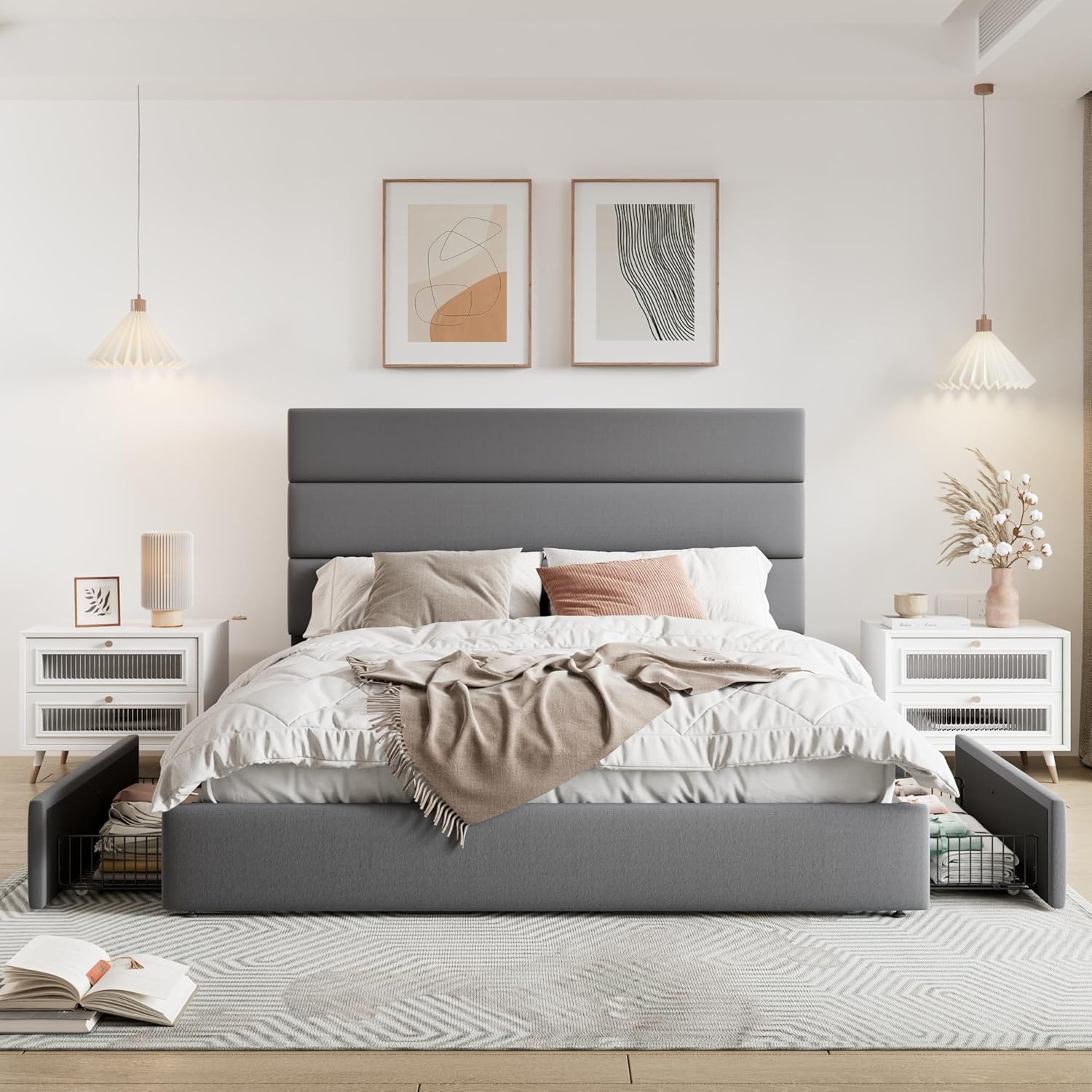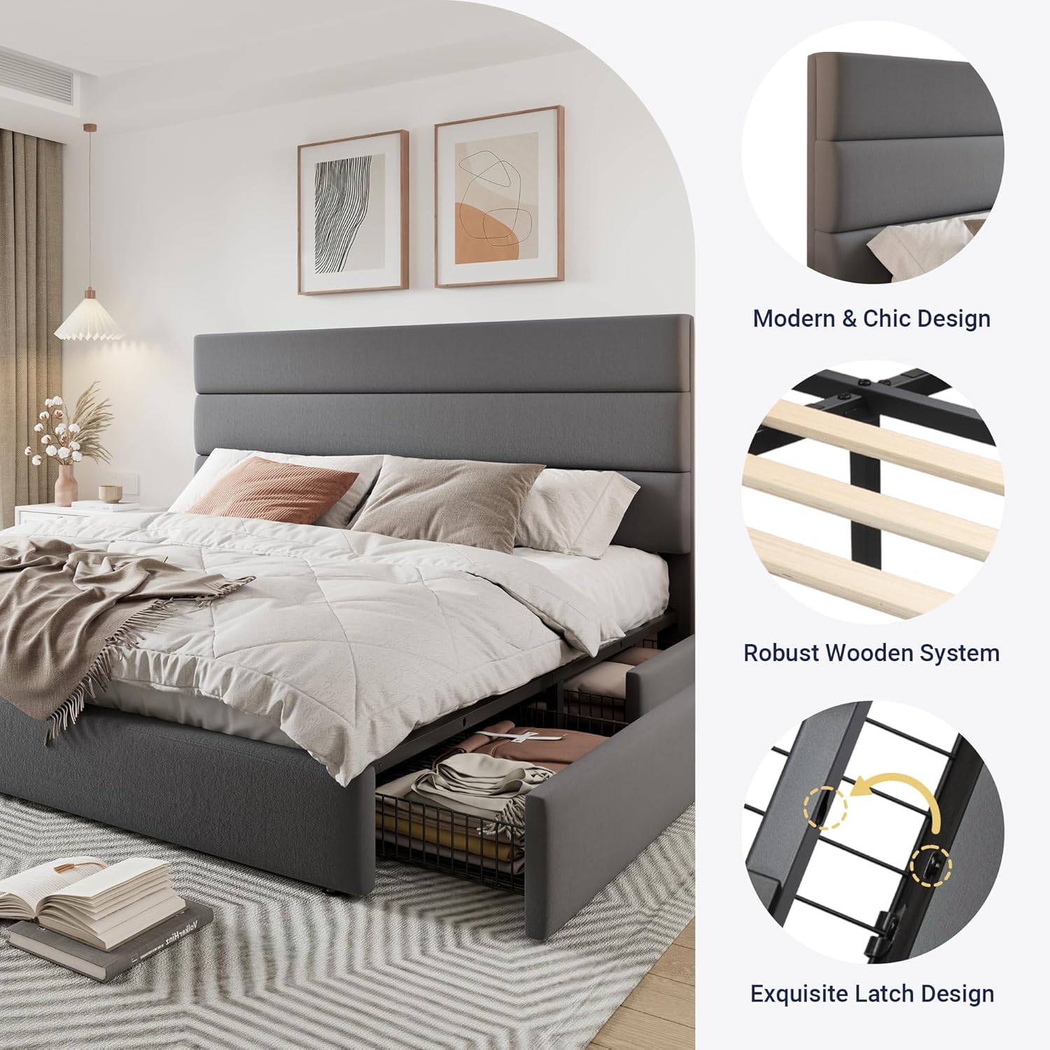 Allewie Modern Queen Size Platform Bed Frame with 4 Storage Drawers and Velvet Upholstered Headboard, Wooden Slats Support, Upholstered Mattress Foundation/No Box Spring Needed/Easy Assembly, Grey