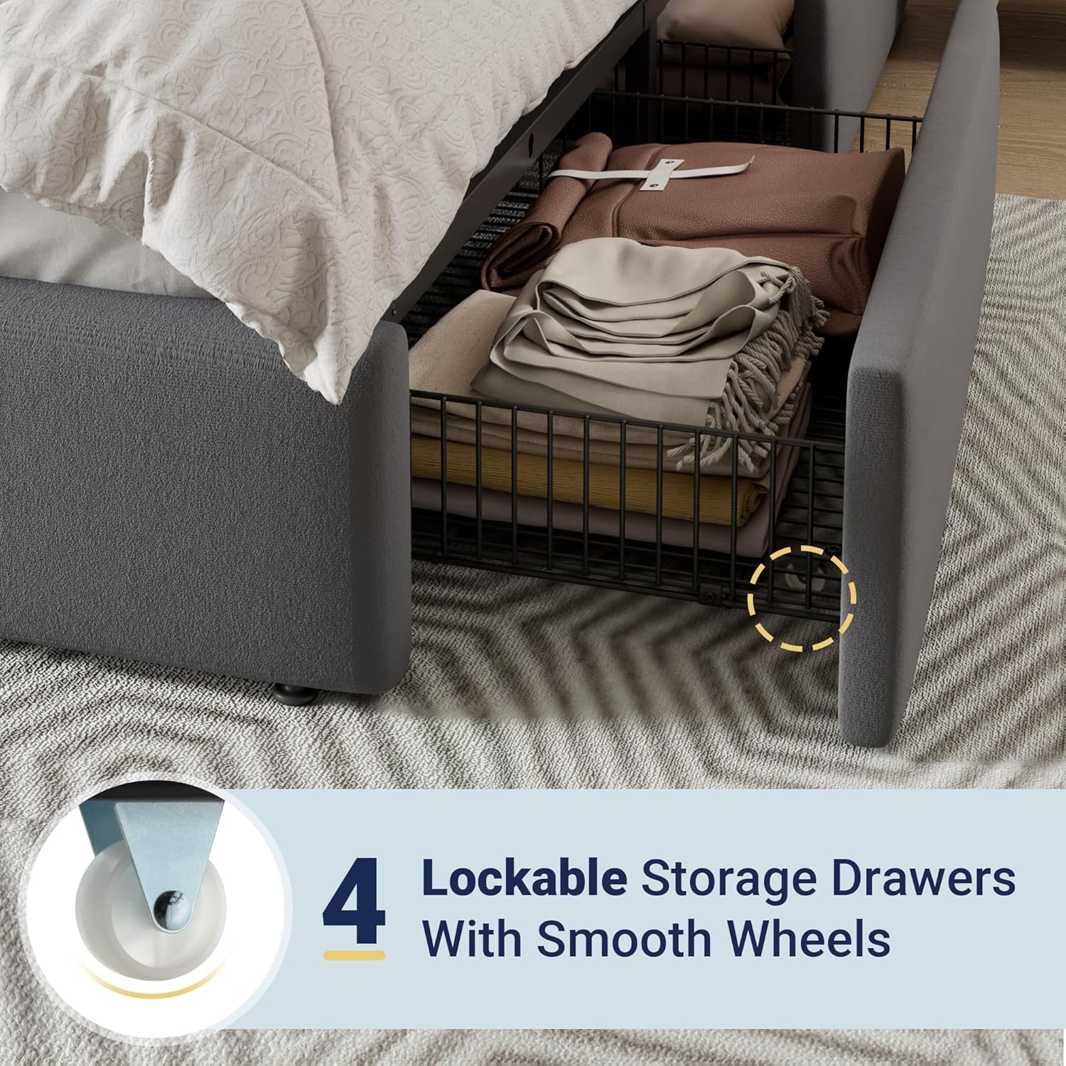 - Ample Under‑Bed Storage: Four large pull‑out drawers on smooth, silent rollers give this full storage bed hidden space for bedding, seasonal clothing, or shoes—maximizing organization without sacrificing floor area.