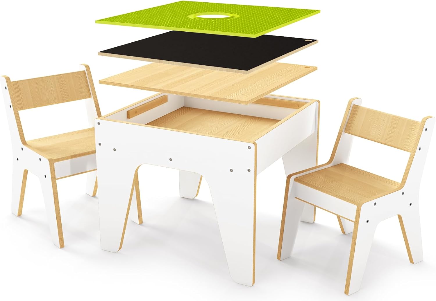 - 4-in-1 Kids Table and Chairs Set: The toddler table and chair set includes 1 table and 2 chairs, 1 flip-Activity tabletop for both learning/crafting and drawing and 1 Dual-Sized Building Baseplates. Remove the top, it can be used as a sensory table