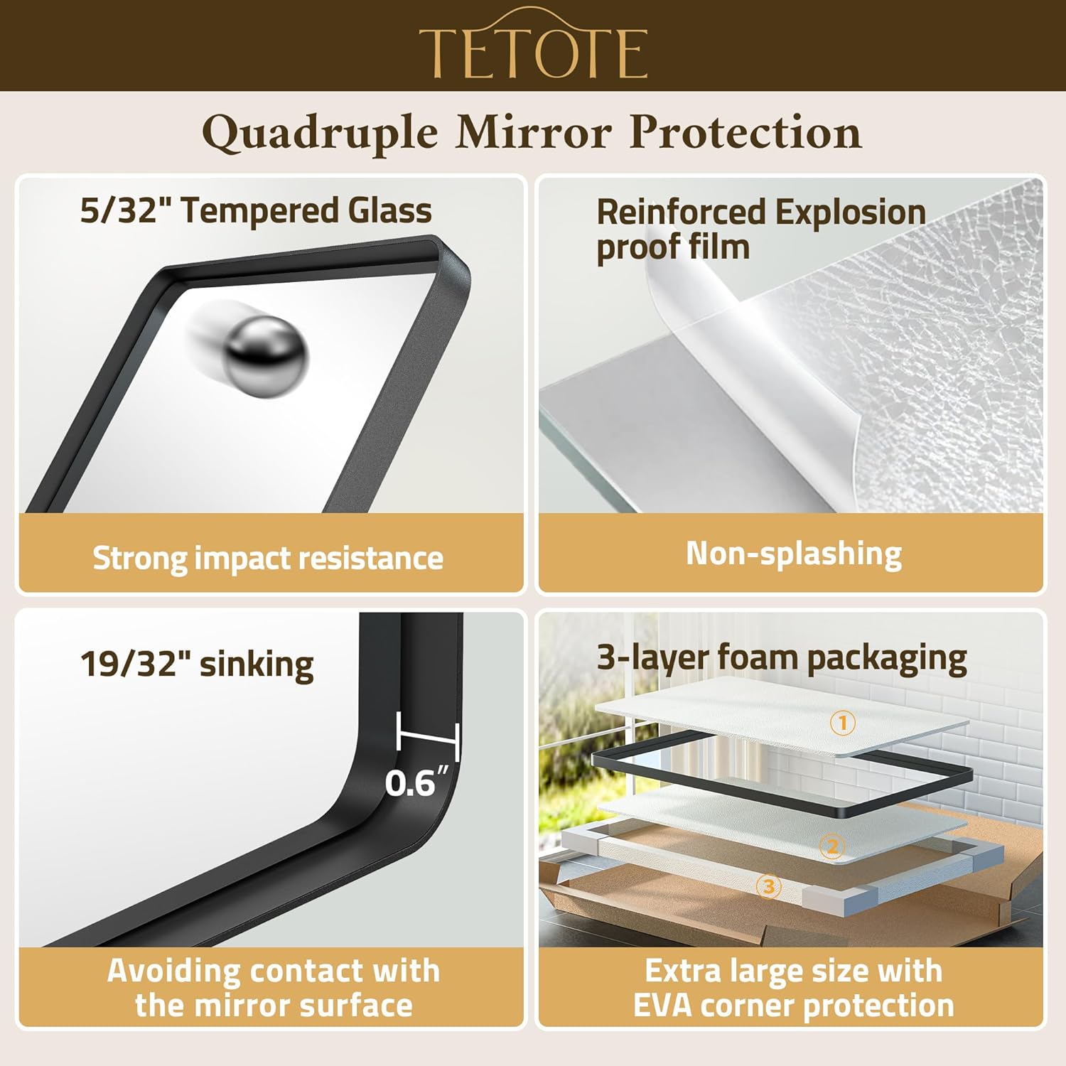 - 【Complete Customer Satisfaction】Brand TETOTE has been committed to providing consumers with premium mirrors and excellent customer experience, we believe that mirrors capture the essence of your daily moments and inspire an elevated life. Our customer support responds within 24/7. We offer a full replacement service for any damaged or chipped mirrors.
