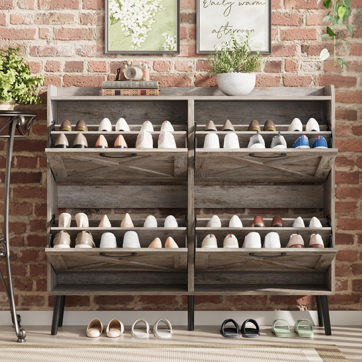 - Entryway Shoe Cabinet: The hidden shoe storage cabinet with 4 flip doors, stylish and simple light rustic oak makes it a neat and beautiful finish and looks great in many different home styles. Perfect for placing in the entryway, hallway, living room, or porch, provides a neat looking in your home and space saving