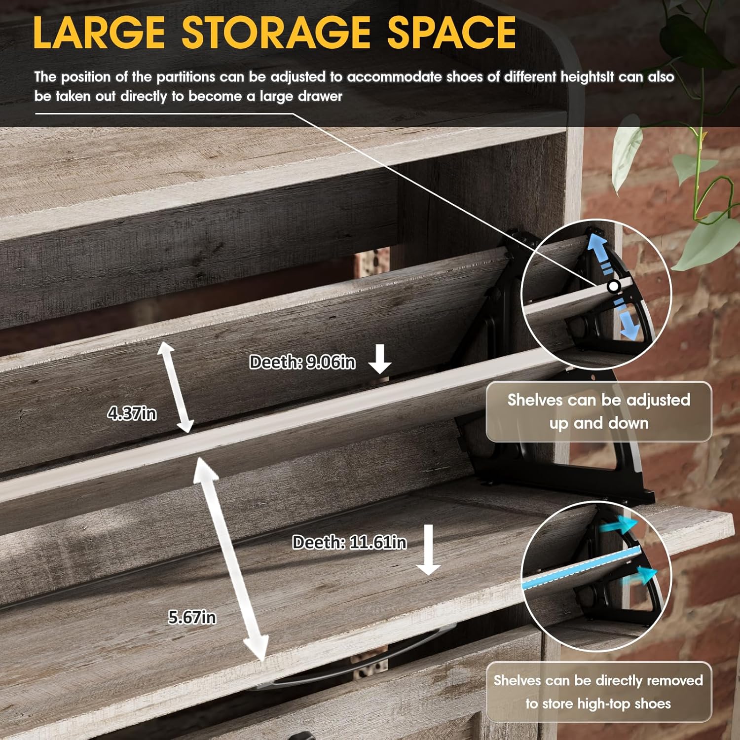 - Narrow Shoe Cabinet: Most other shoe cabinets have a depth of 14-15in, while our slim shoe cabinet depth front to back is 9.35in! Only half the volume of other shoe cabinets, but it can neatly hide and store more and larger shoes! Innovative flip space-saving design, bringing more space in the entry area or hallway