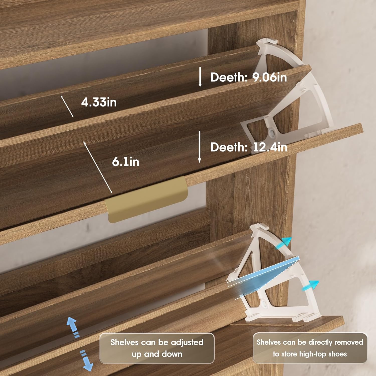 - Narrow Shoe Cabinet: Most other shoe cabinets have a depth of 14-15in, while our slim shoe cabinet depth front to back is 9.35in! Only half the volume of other shoe cabinets, but it can neatly hide and store more and larger shoes! Innovative flip space-saving design, bringing more space in the entry area or hallway