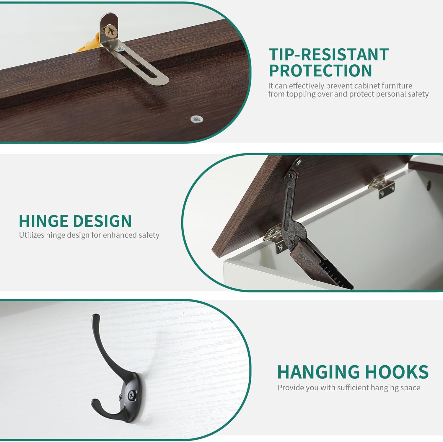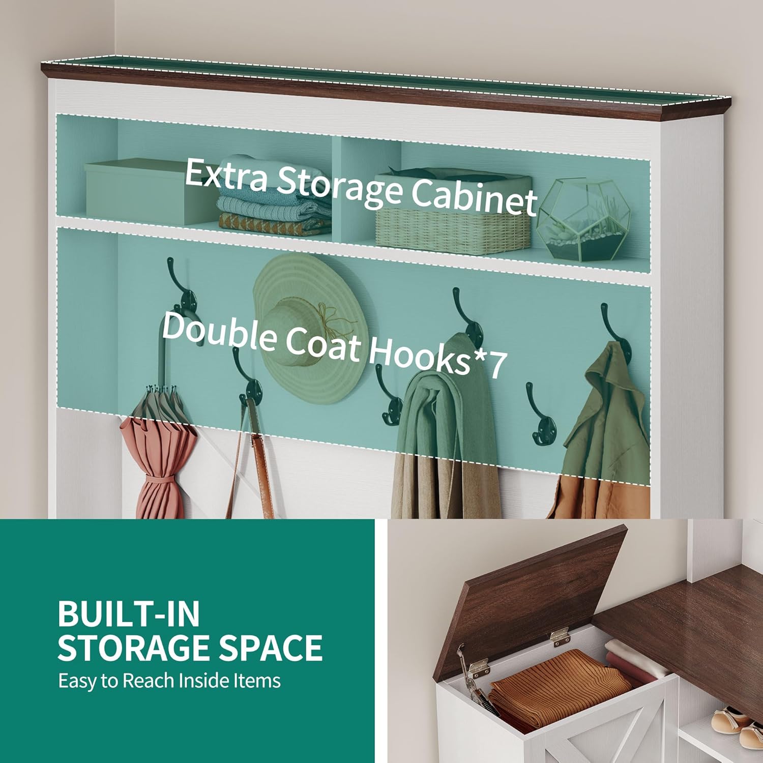 - Multiple Storage Options: Combines 5 tiered shoe shelves (holds up to 8–13 pairs), 7 double hooks for coats/hats/keys, 2 open-top compartments for baskets or décor, and a hidden seat storage compartment for shoes, gloves, or cleaning supplies.