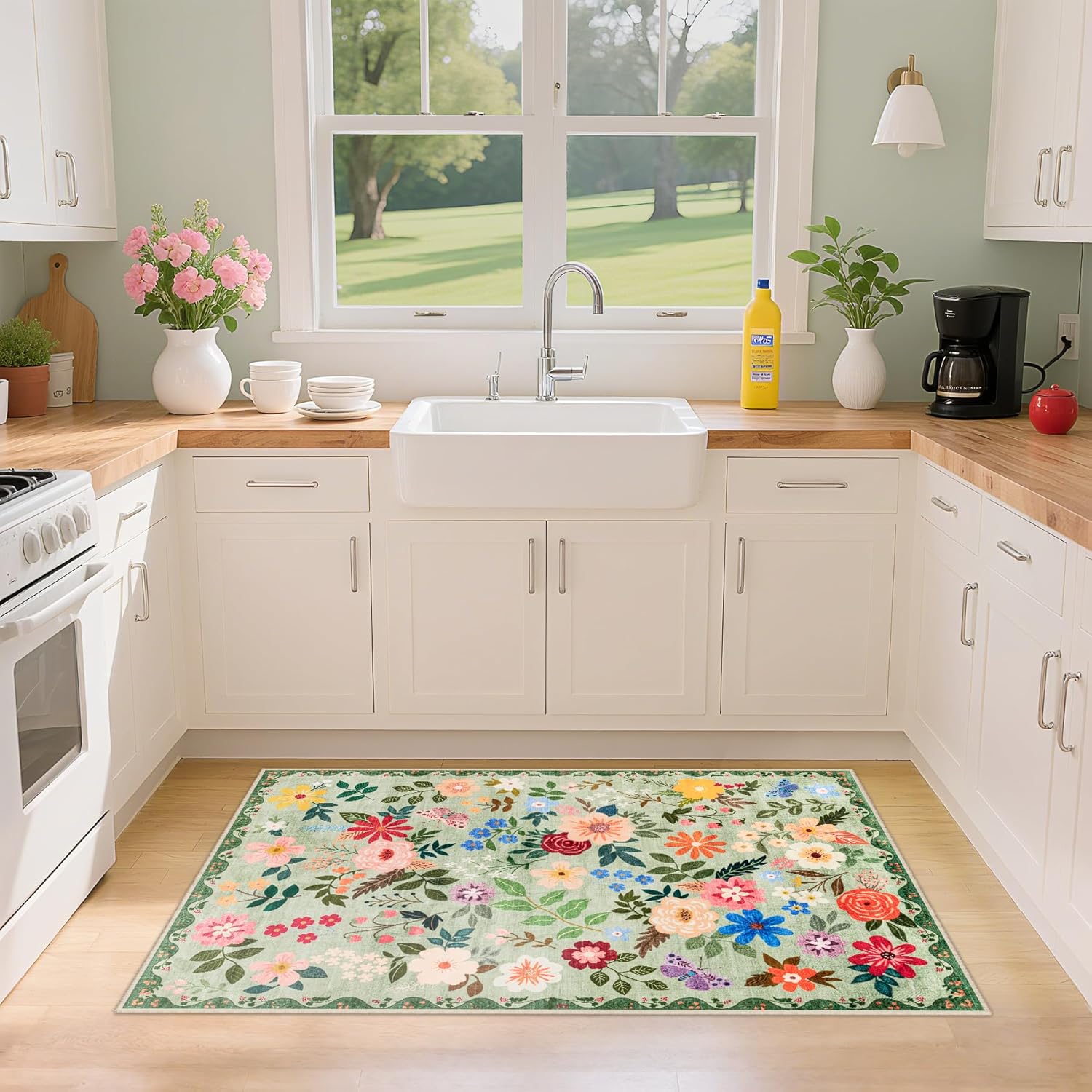 Entryway Rug 2X3 Small Rugs: Floral Washable Door Mat Vintage Soft Low Pile Non-Slip Kitchen Rugs Stain Resistant Indoor Throw Rug for Entrance, Bedroom, Kitchen, Laundry, Bathroom Green