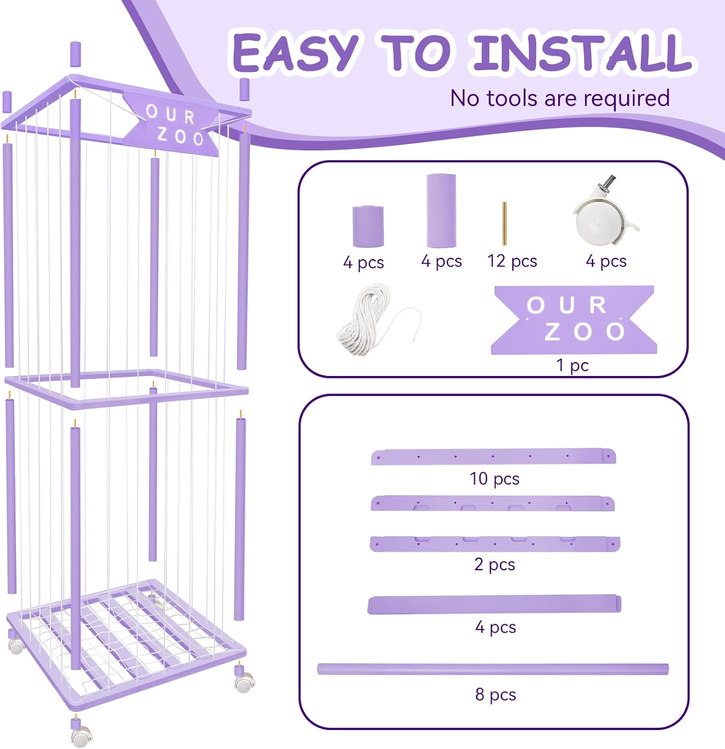 Stuffed Animal Storage Zoo with Wheels, Wooden Large Stuff Animals Plushies Holder Toy Organizer Kids Plush Storage Cage with Elastic Band and Net for Nursery Playroom Corner for Toddler (Purple)