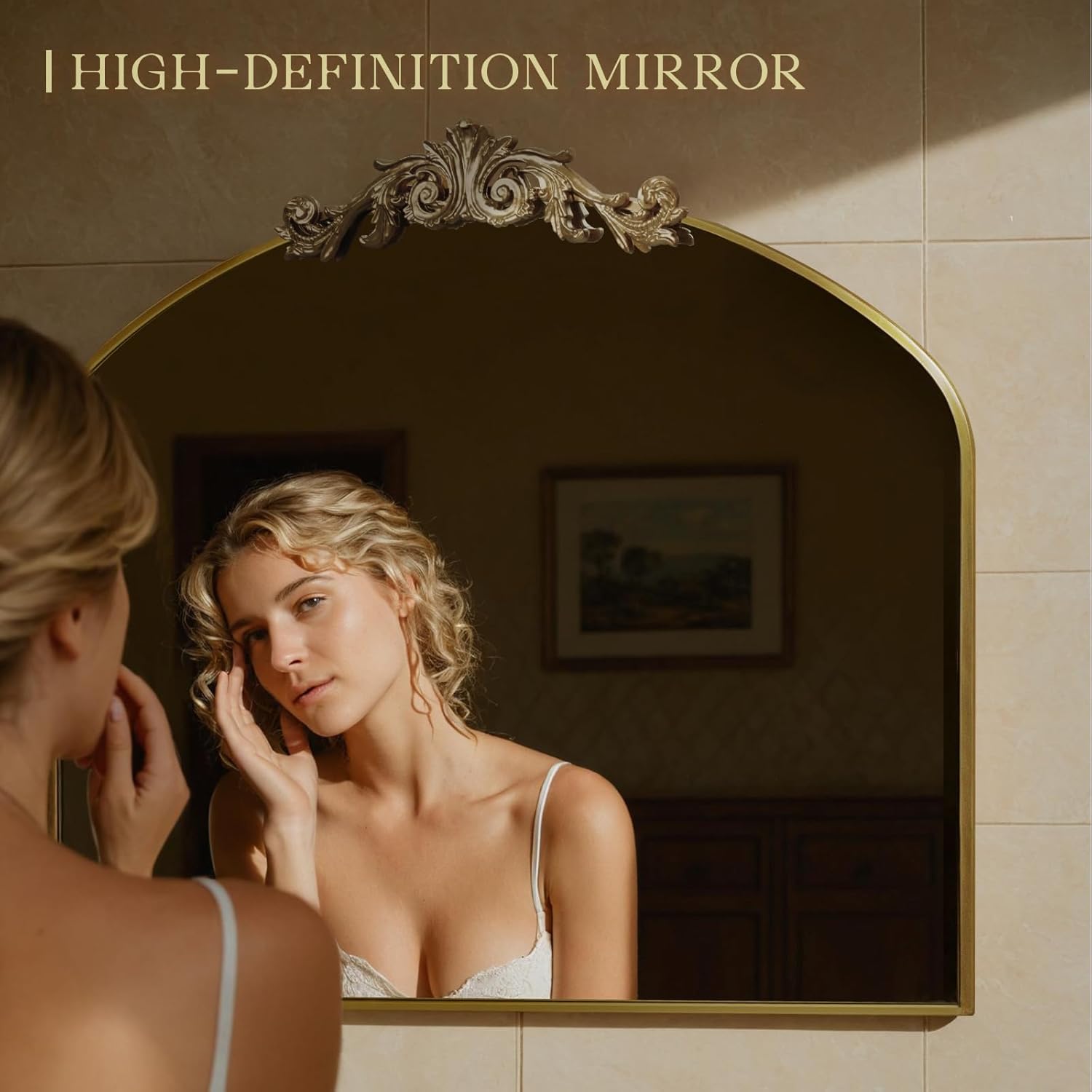 MISSDAY Vintage Retro Bronze Baroque Mirror for Wall, 36"X30" Arched Antique Wall Mirror with Elegant Carving Top, Full Metal Frame Wall-Mounted Mirror for Bathroom, Living Room, Fireplace, Entryway