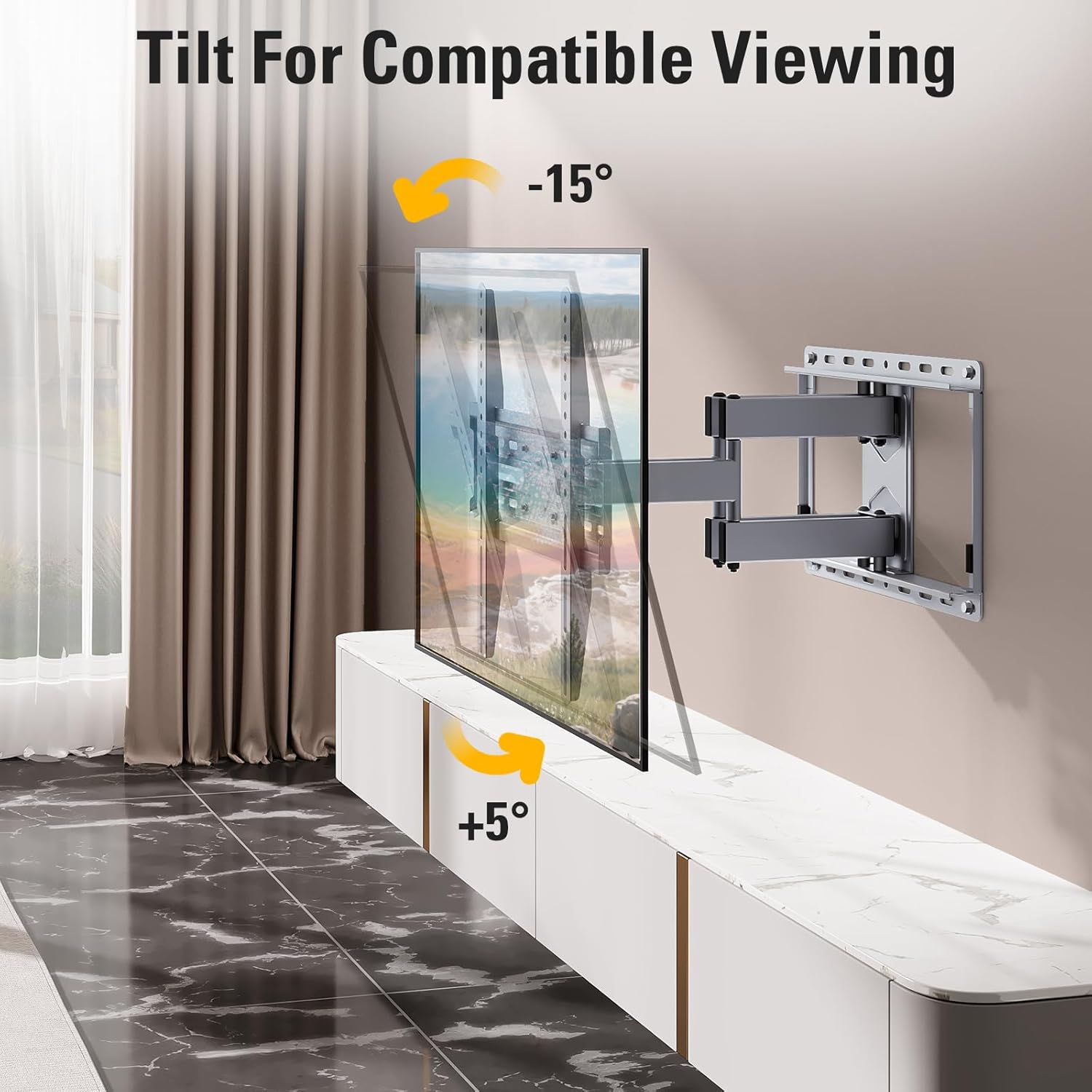 - Enhance Your View: This full motion TV mount tilts TV up 5° and down 15° to reduce glare, and swivels TV left or right 45°according to your seat position. Pull out to 17.5" and retract back to 3.4", making your TV alive to move