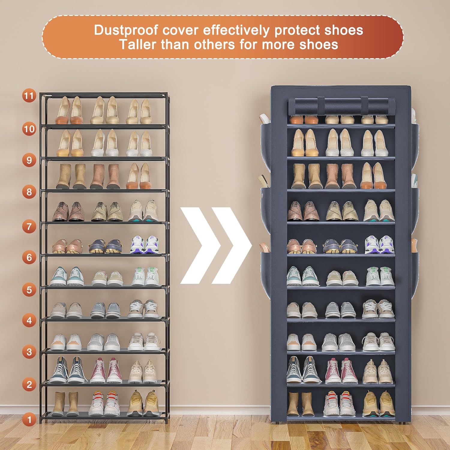 Shoes Rack 10 Tier Tall Shoe Rack with Storage Pockets, Fabric Covered Shoe Racks,Metal Shoes Rack Organizer for Closets,Bedroom, Garage
