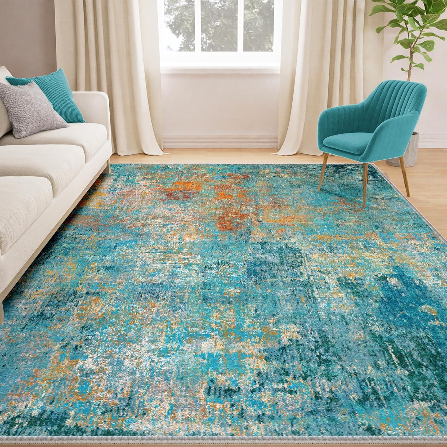 Washable Area Rugs 7'x9' Non-Slip Modern Abstract Soft for Living Room Entryway Bedroom Nursery, Print Pattern, Teal Blue Green Orange Rust Red Colorful