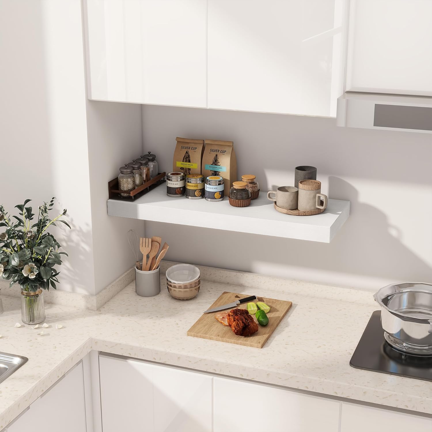 - ăDECORATIVE & FUNCTIONALăThe wall-mounted floating shelves are designed for decoration and storage, utilizing and decorating any space in your home. Used as shelf decor to show your collection, books, or prize, the hanging shelves are perfect for displaying your photo frame, small plants, model, or audio in your living room, office, study. And can also use as over the toilet storage shelf in the bathroom to hold toiletries or used as kitchen shelf to storage condiments.