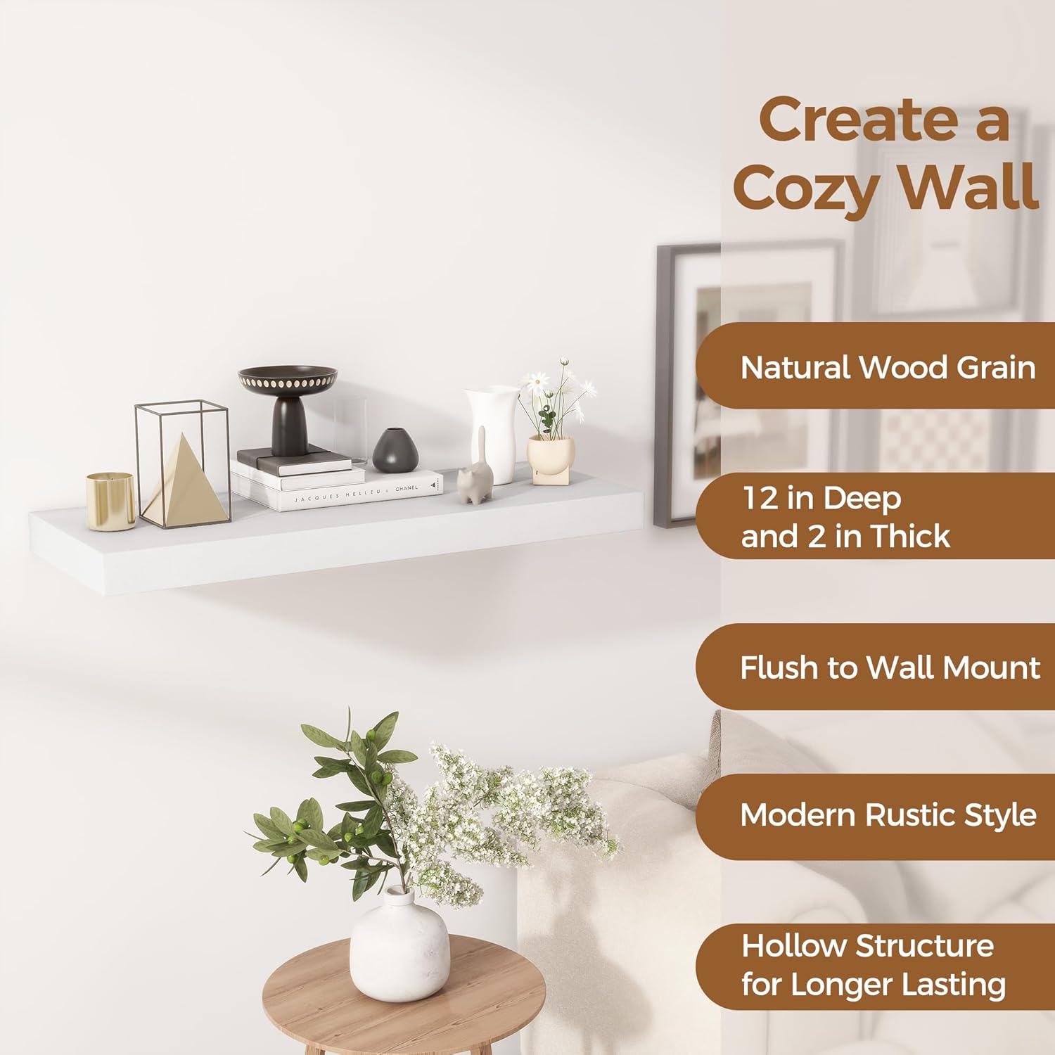 - ăFARMHOUSE RUSTIC WALL SHELFăThese floating shelves are made of premium engineered wood board and invisible one-piece bracket. The rustic wooden grain surface add character and warmth to any modern or traditional interior with these thick floating shelves, contrast shelves at staggering heights on the wall or mount side-by-side or in the corner for a clean streamlined look.