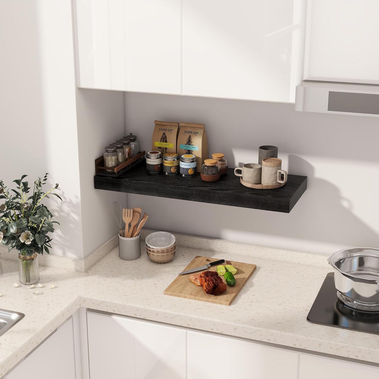 - ăDECORATIVE & FUNCTIONALăThe wall-mounted floating shelves are designed for decoration and storage, utilizing and decorating any space in your home. Used as shelf decor to show your collection, books, or prize, the hanging shelves are perfect for displaying your photo frame, small plants, model, or audio in your living room, office, study. And can also use as over the toilet storage shelf in the bathroom to hold toiletries or used as kitchen shelf to storage condiments.
