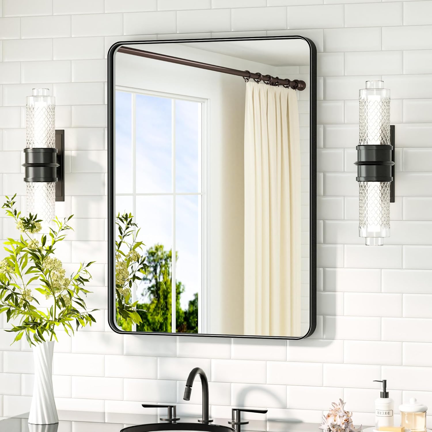 - 【Timeless Design with a Modern Touch】The combination of rounded corners and a floating mirror in this design perfectly marries classic elements with contemporary style. This thoughtful construction not only enhances tactile comfort but also creates a sense of visual expansiveness, while the integrated frame of this bathroom vanity mirror elevates the overall aesthetic appeal.