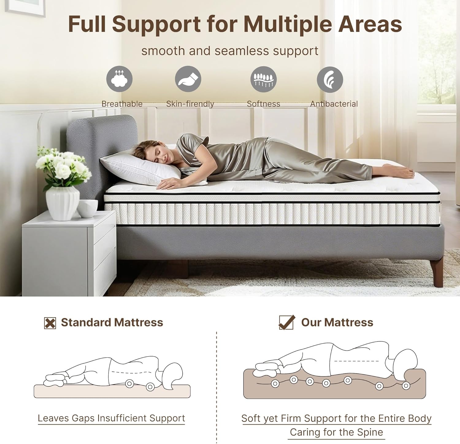 - 【Motion Solation】The medium firm mattress support system consists of hundreds of independently wrapped springs, each of which can operate independently, with excellent shock absorption and elasticity. Multiple layers of comfort foam on the mattress reduce the noise of tossing and turning on the other side, so you won't be woken up by your partner's tossing and turning or your pet's midnight fuss.