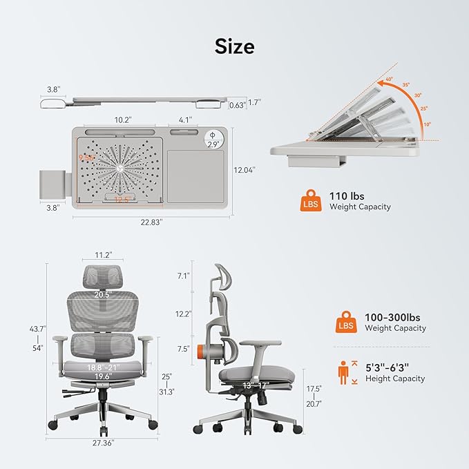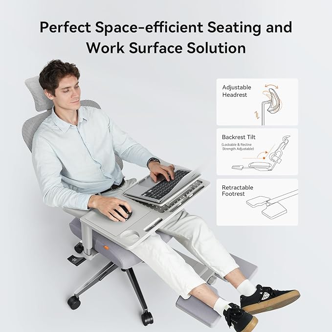 Newtral Office Chair Ergonomic - Home Office Desk Chair, Back Pain Chair with Auto-Following Lumbar Support, 4D Armrest, Seat Depth and Height Adjustable (Foot Rest + Laptop Tray, Gray)