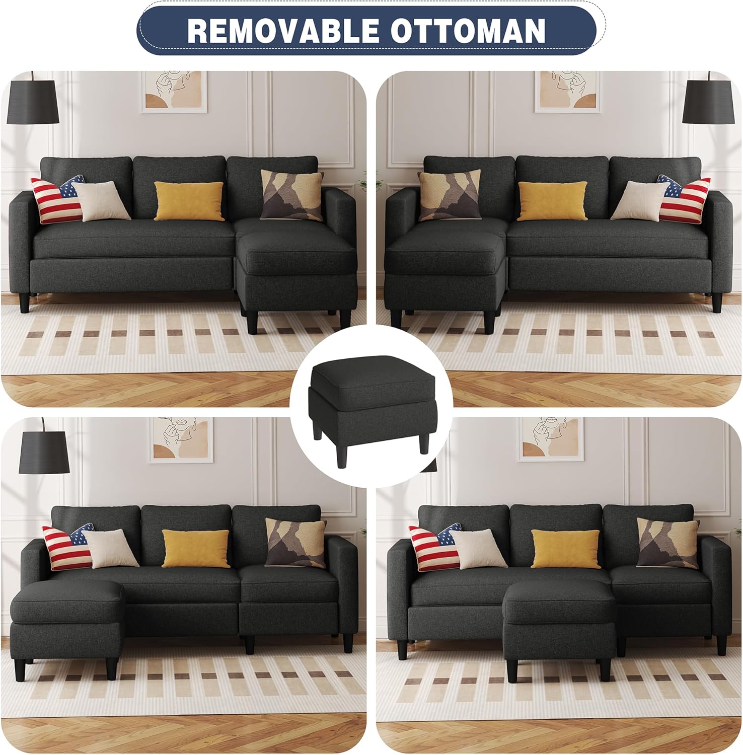 - Convertible Couch: This sectional couch sofa with a movable ottoman, you can place it on left or right of sofa couch to make up a chaise longue, which can take a nap at any time and change the style in your living room.