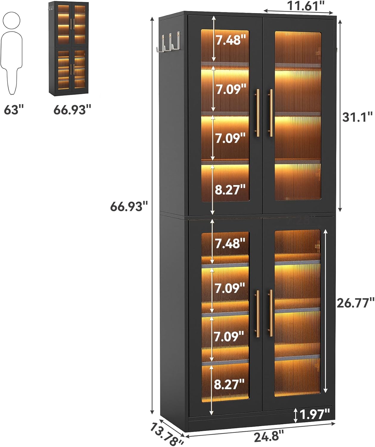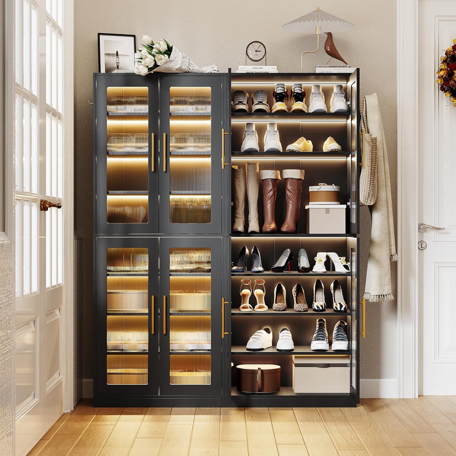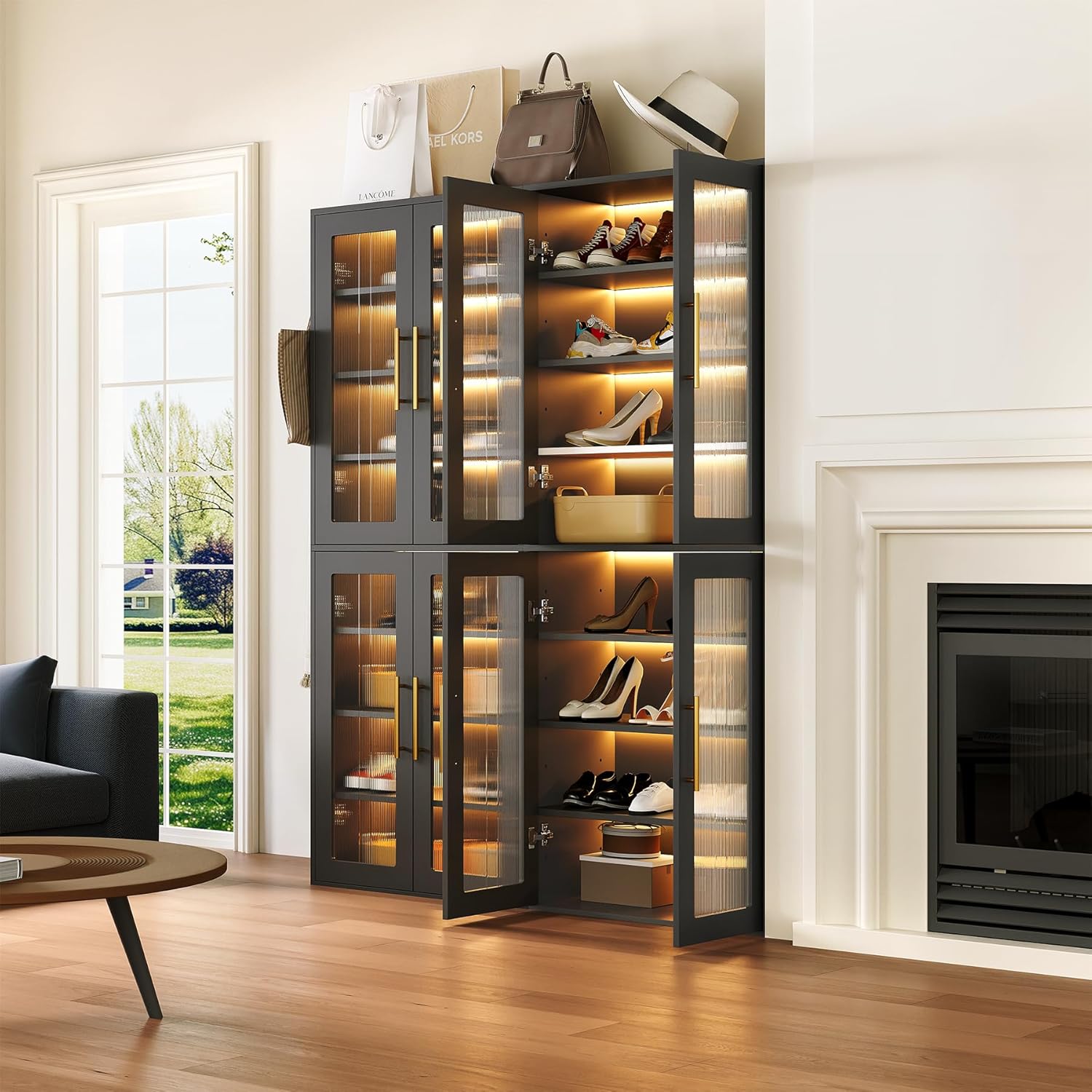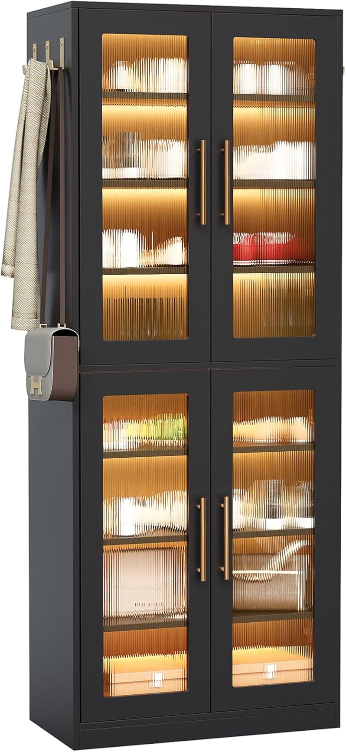 LITTLE TREE Stylish 8-Tier Vertical Shoe Rack with Built-in LED Lighting, Doors for Dust Protection, and Convenient External Hooks, Shoe Cabinet for Entryway, Living Room, Bedroom, Black