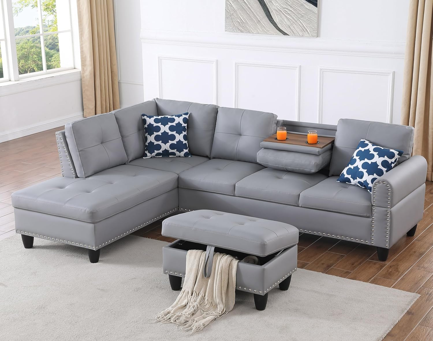 - Special Feature : with 2 Pillows, with Chaise & Storage Ottoman, with Cup Holders & Coffee Table, with Nailhead Trim with 2 Pillows, with Chaise & Storage Ottoman, with Cup Holders & Coffee Table, with Nailhead Trim