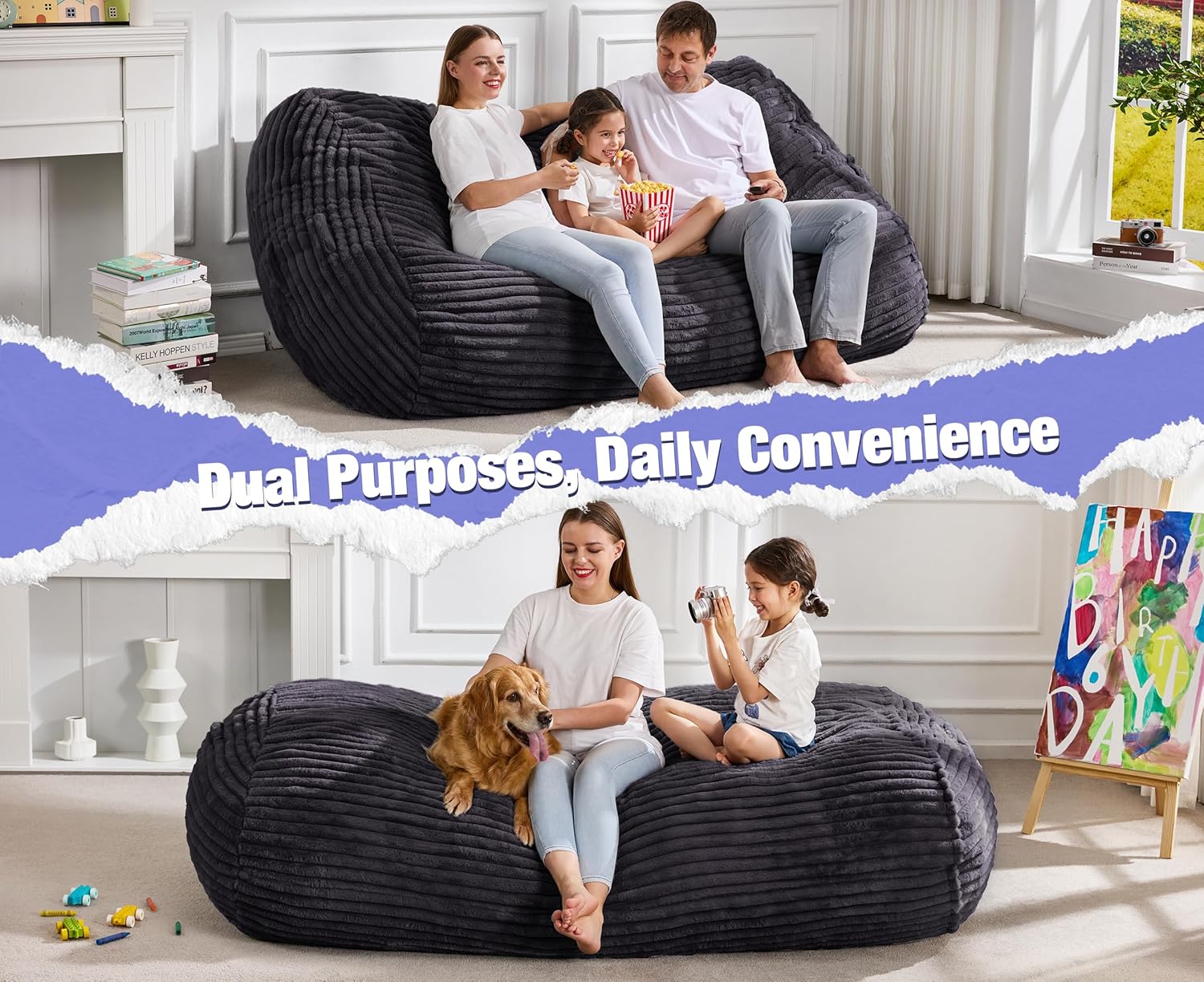 - No assembly Required: Our giant bean bag chair for adults is no assembly required, just open the package and let the bean bag chairs take up 48 hours to fully expand. When you sit on the bean bags for a long time, the foam inside may become unevenly distributed. To ensure optimal comfort and shape, please give the adult bean bag chair a few good shakes to redistribute the foam more evenly and make it plumper.