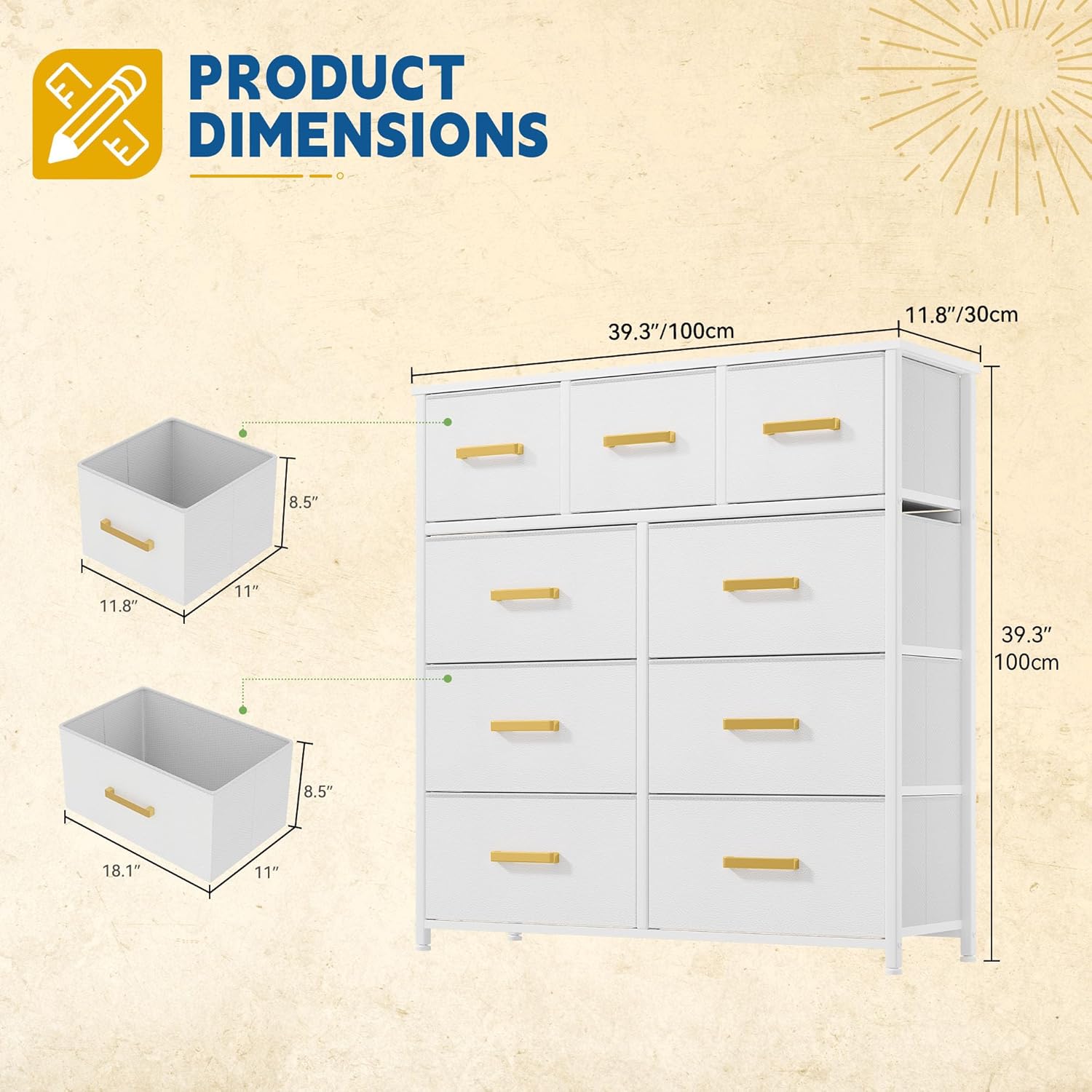 - LARGE STORAGE CAPACITY- The DWVO 9-Drawer dresser conveniently organizes your scarves, socks, T-shirts, pants, sunglasses, books, etc.; Overall dimensions: 39.4" L x 11.8" W x 39.4" H; Large drawer dimensions: 18.1" L x 11" W x 8.5" H; Small drawer dimensions: 11.8" L x 11" W x 8.5" H