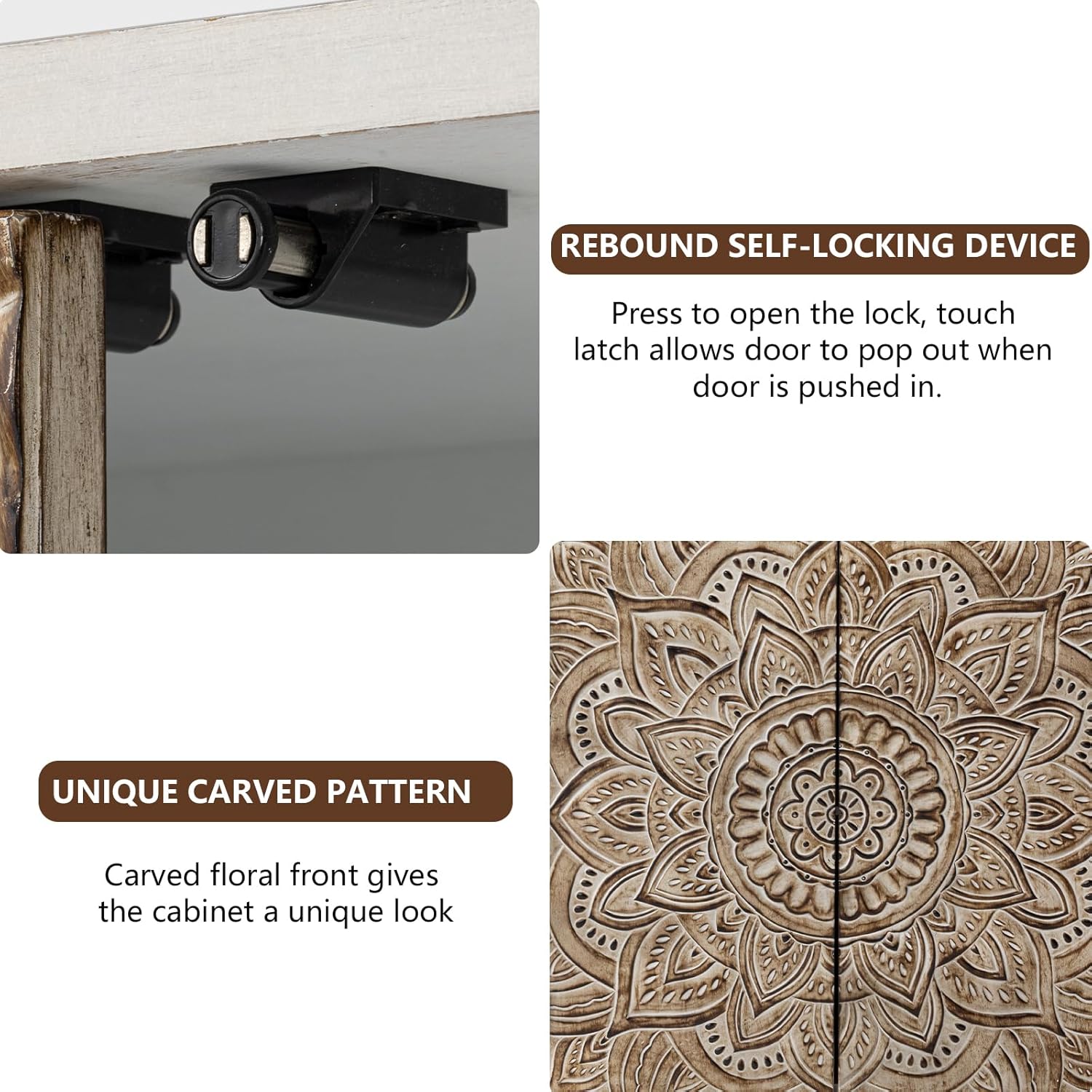- ăArtful Lotus CarvingăThe gray pinewood doors feature intricate lotus carvings that reflect timeless craftsmanship. With push-to-open magnetic doors and inward hinges, these cabinets blend functionality with elegant form.