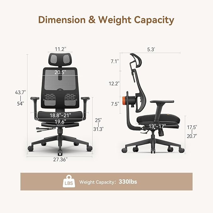 - 【Full-Body Customization】Fine-tune seat depth (up to 4"), height (28"-33"), backrest height, and 136° tilt lock to fit users 5'0"-6'5".