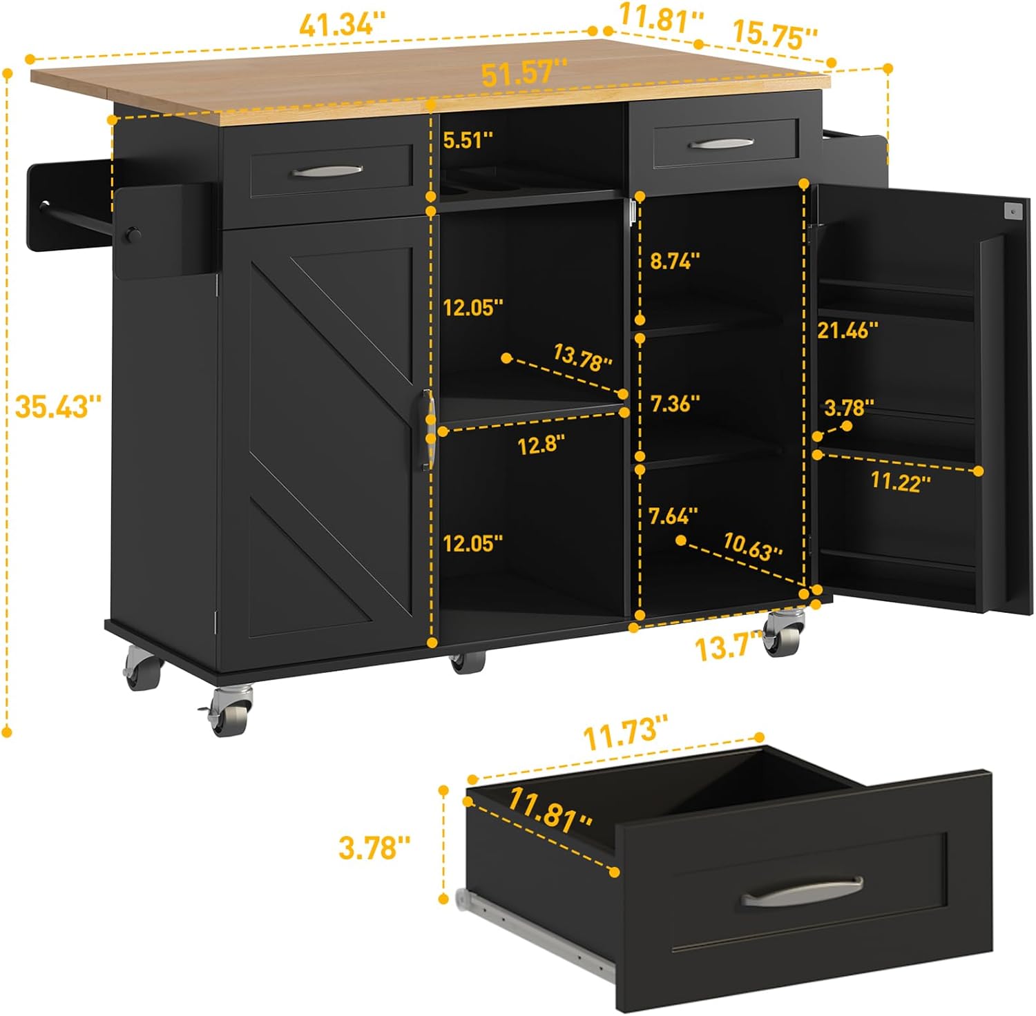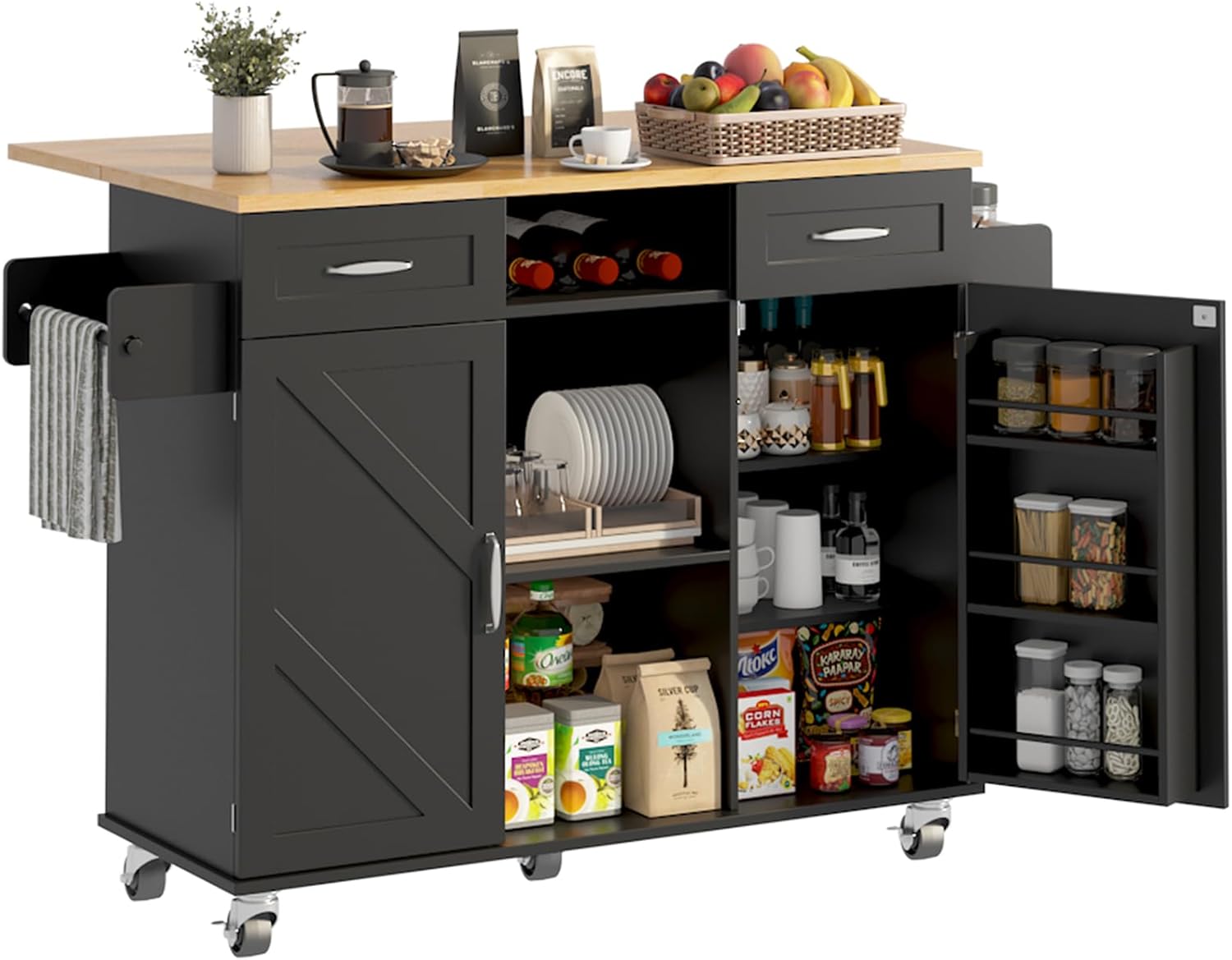 51.5'' Rolling Kitchen Island with Storage Cabinet & Drawers, Drop Leaf Kitchen Cart on Wheels, Farmhouse Portable Mobile Islands, Large Butcher Block Table with Tower/Spice Rack, Black