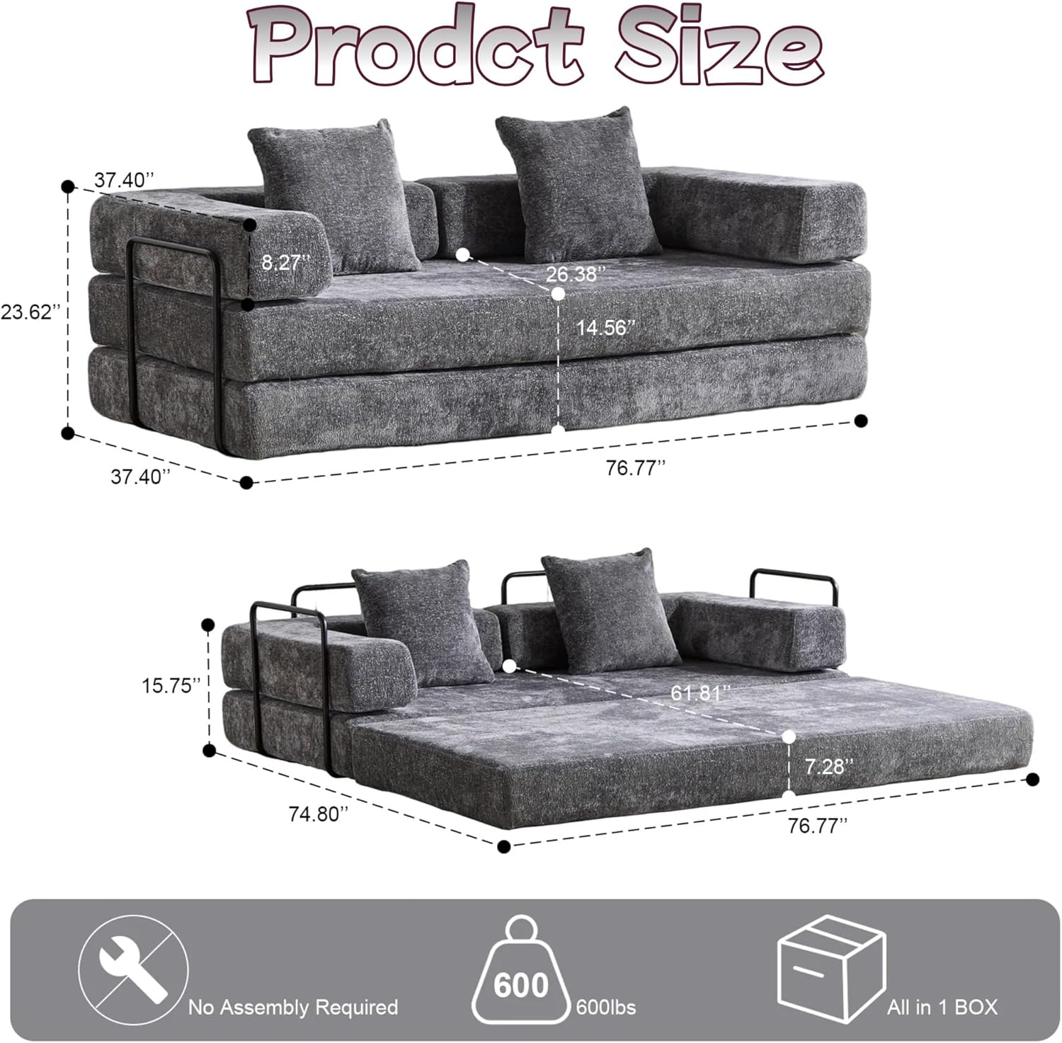 - Comfortable Chenille Fabric: The contact surface of the convertible folding sofa is made of chenille fabric, which has a dense pile surface and is soft and delicate to the touch. The internal fiber structure is sturdy, not easy to pill and hook in daily use, can withstand frequent sitting and friction, and has a long service life. Pillows and armrests enhance your experience.