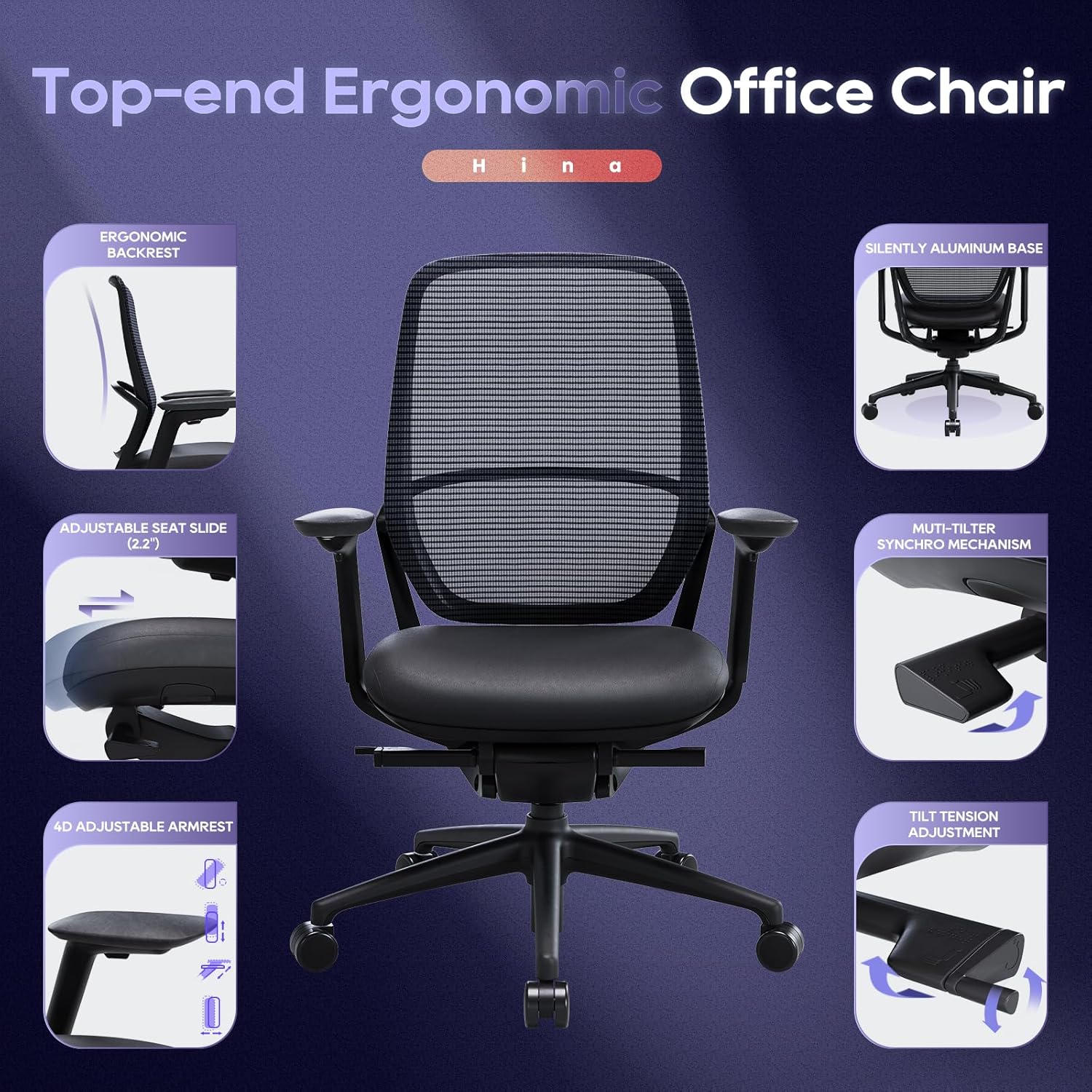 Ergonomic Office Chair Without Headrest, Genuine Leather Seat, Adjustable Seat Depth, 4D Armrests, Aluminum Alloy Base, Mesh Back, High-End Executive Desk Chair Black (Obsidian Black)