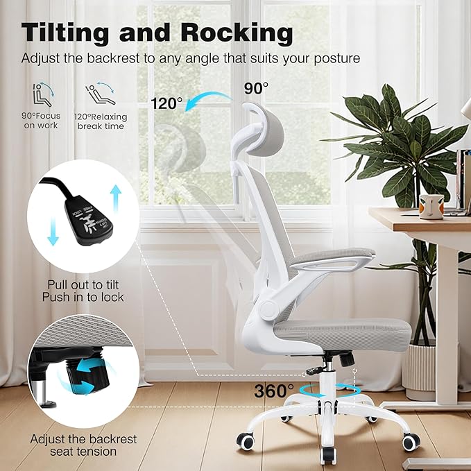 - 【Space-Saving Flip-Up Armrests】This desk chair has flip-up armrests with high-density foam pads. Flip the armrests 90° upward to store under the table, saving space. Versatile for home offices, meeting rooms, gaming setups, and more as an ergonomic office chair