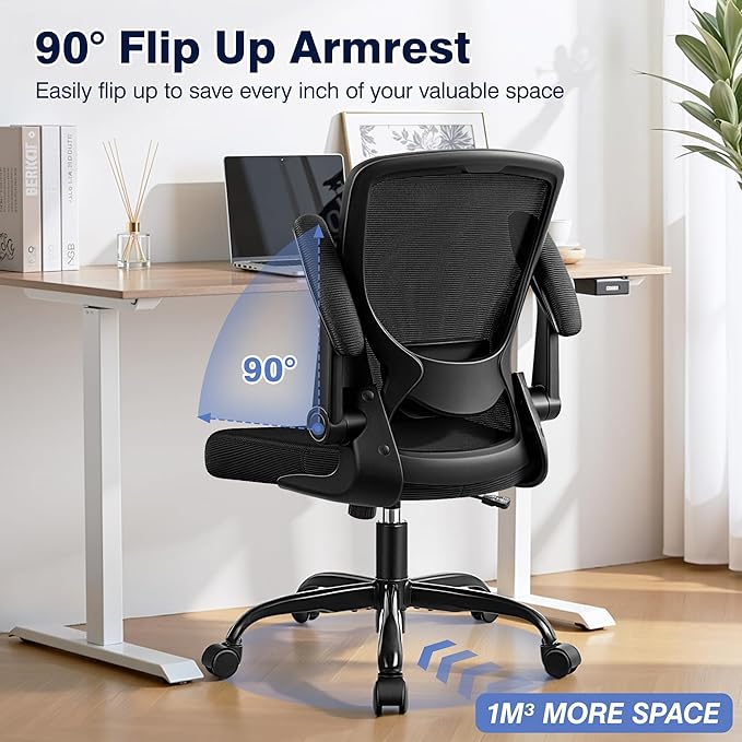 - 【Space-Saving Flip-Up Armrests】 Maximize your workspace with 90° flip-up armrests. Effortlessly tuck them away when not in use, allowing the desk chair to slide fully under desks for neat storage and creating flexible seating arrangements in compact environments.