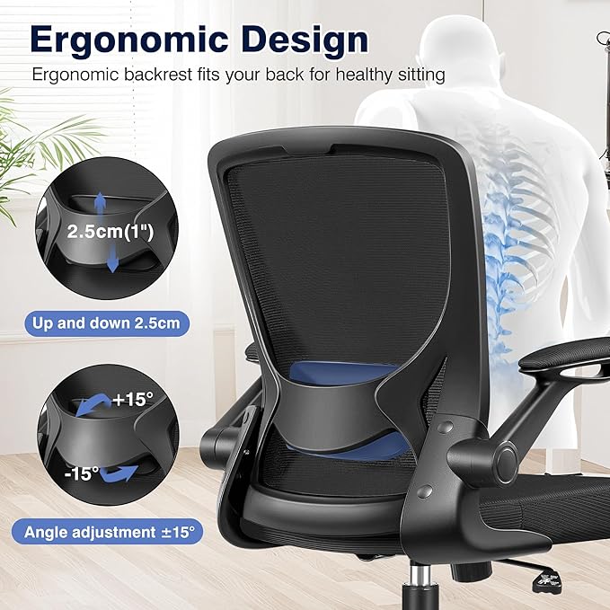 Ergonomic Office Chair, Mesh Computer Chairs with Lumbar Support, Swivel Desk Chair with Flip-up Arms and Adjustable Height, Black