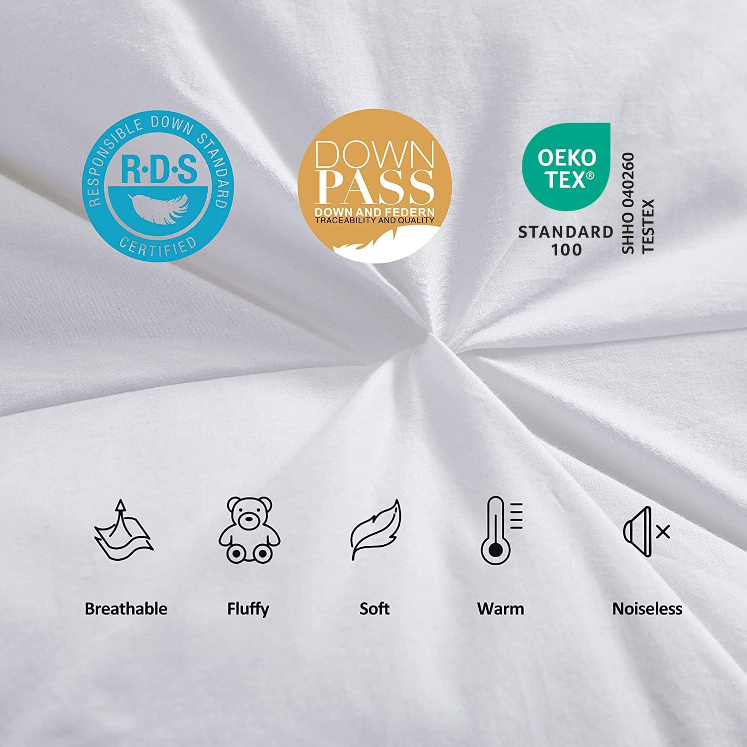 - OVERSIZED KING size comforter is 120 x 120 inches, filled with 75 oz. fill weight, cloud like fluffy, made using responsibly sourced down feather fiber (80% Down Fiber & 20% Waterfowl Feather Fiber), certified to the Responsible Down Standard (RDS Certified), Downpass and STANDARD 100 by OEKO-TEX.