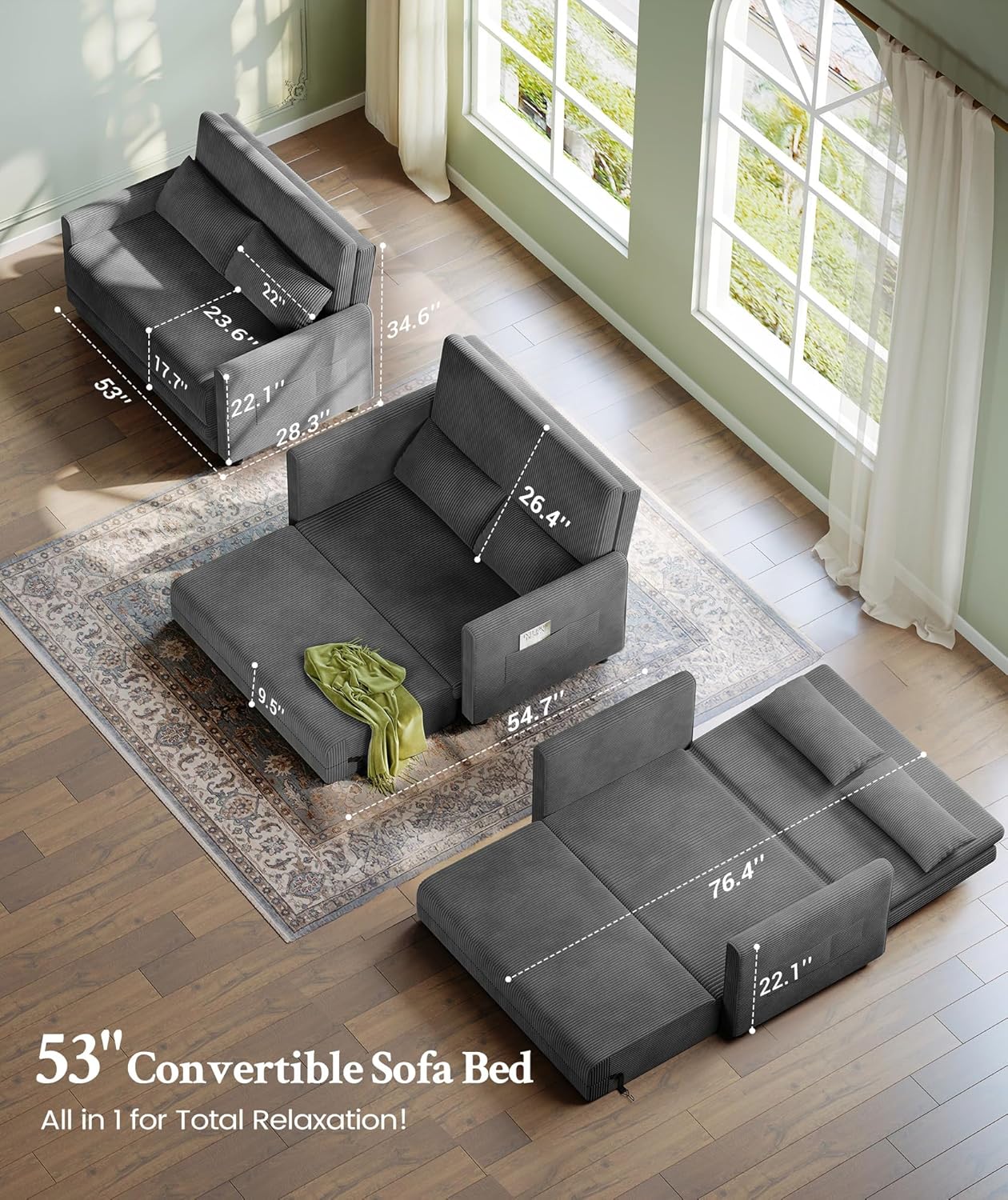 53” Convertible Sofa Bed Couch, Corduroy Couch Bed, 6-Position Loveseat Sleeper Sofa, Love Seat Sleeper Bed 23.6" Extra Deep Seat, Modern Couches for Living Room/Apartment/Home/Office, Grey