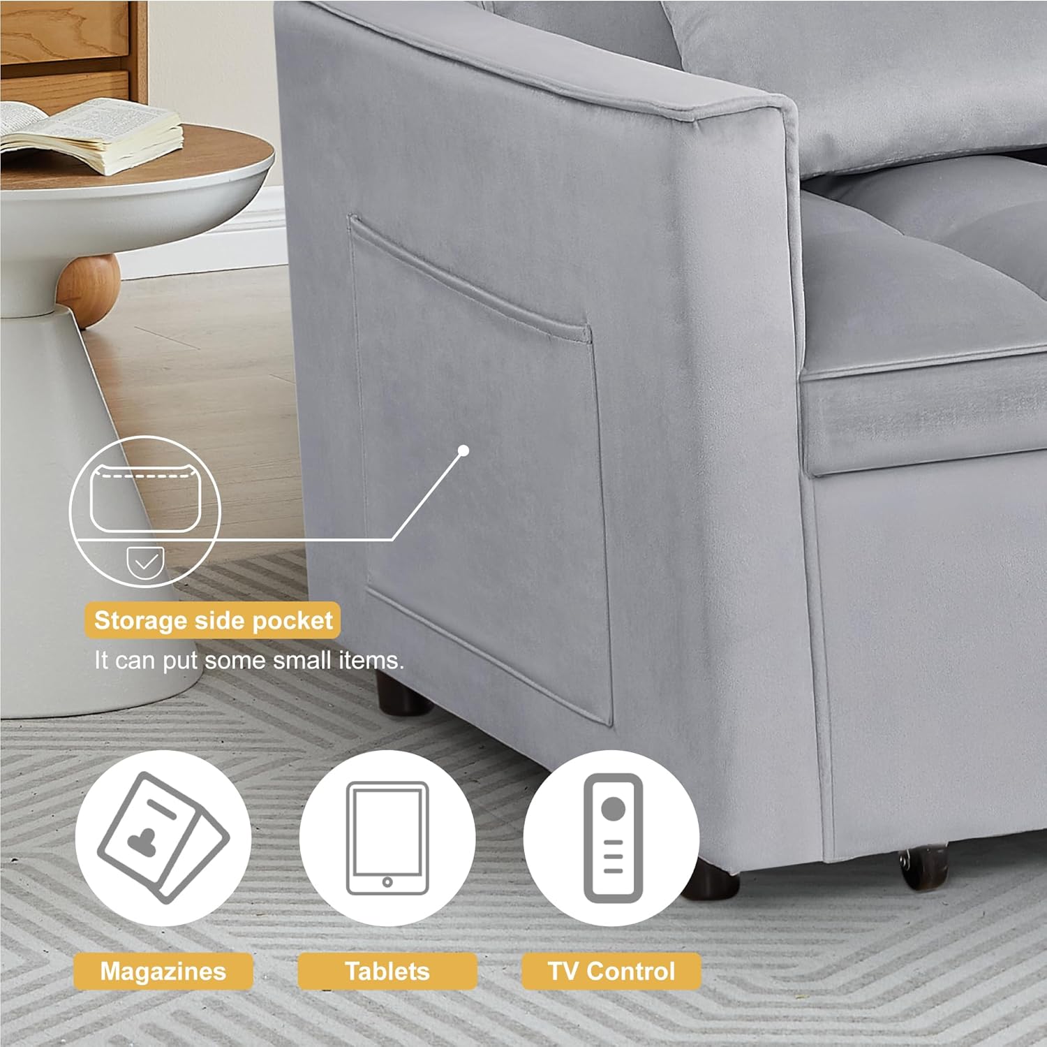 - Storage Pockets Design: With side storage pockets, this sleeper sofa and convertible sofa helps to keep everything you need all in one place.Large side pockets can store your cell phone, remote control, magazines, newspapers, etc, making storage simple and easy.