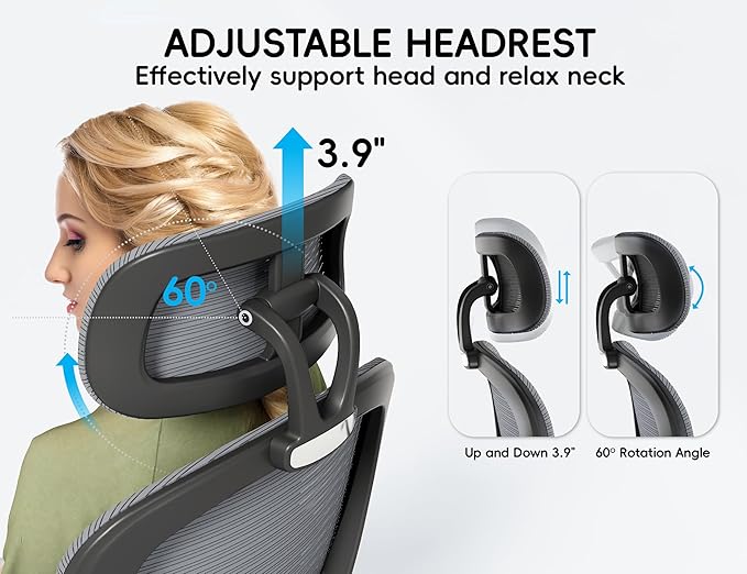 - Adjustable 3D Headrest for Neck & Shoulder Reliefļ¼Customize your comfort with our 3D adjustable headrest, designed to cradle your neck and shoulders in the ideal position. Tilt, height, and angle adjustments ensure proper alignment, reducing strain from hours at your desk. Finally, a chair that cares for your posture as much as you do