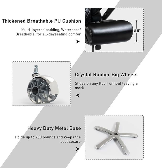 - "Premium Design & Safety Assurance Built with a strong metal frame, refined craftsmanship, and high-quality materials, this heavy duty office chair ensures lasting stability and durability—an ideal choice for executive chairs. with an SGS-certified Class-4 explosion-proof gas lift and a reinforced base, both tested over 100,000 cycles for reliability and safety. From the smooth-rolling casters to the overall structure, every detail is designed to deliver an exceptional sitting experience